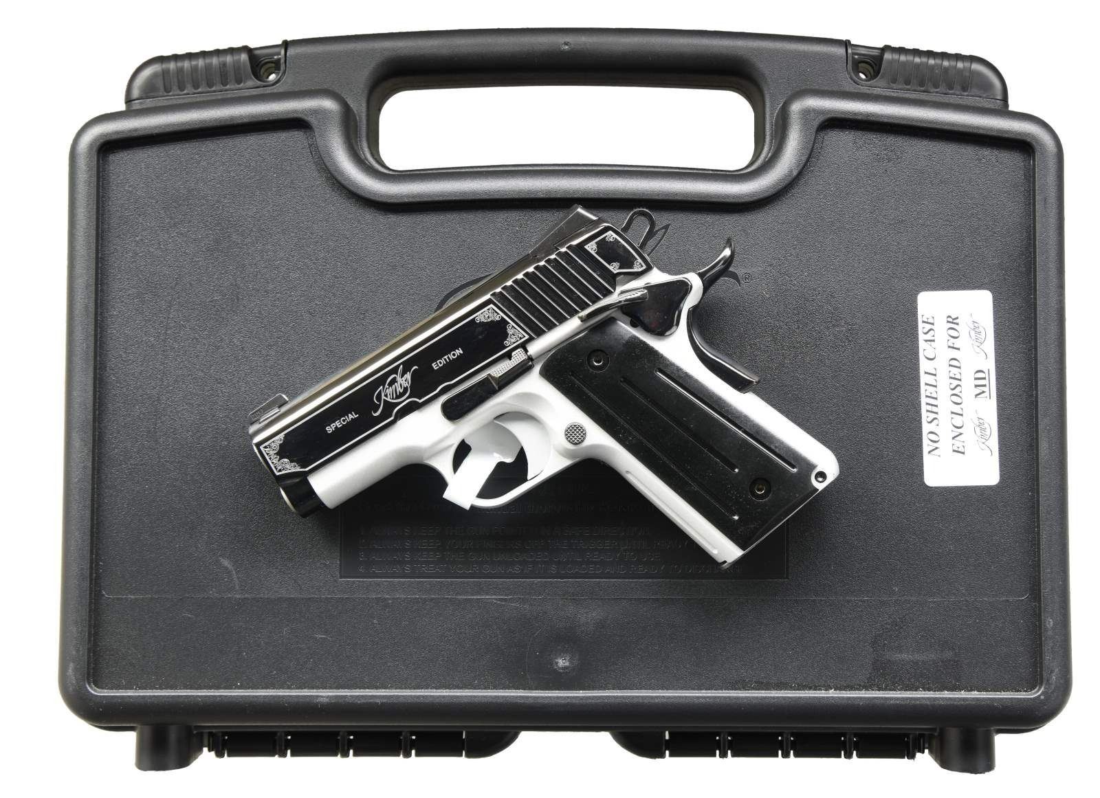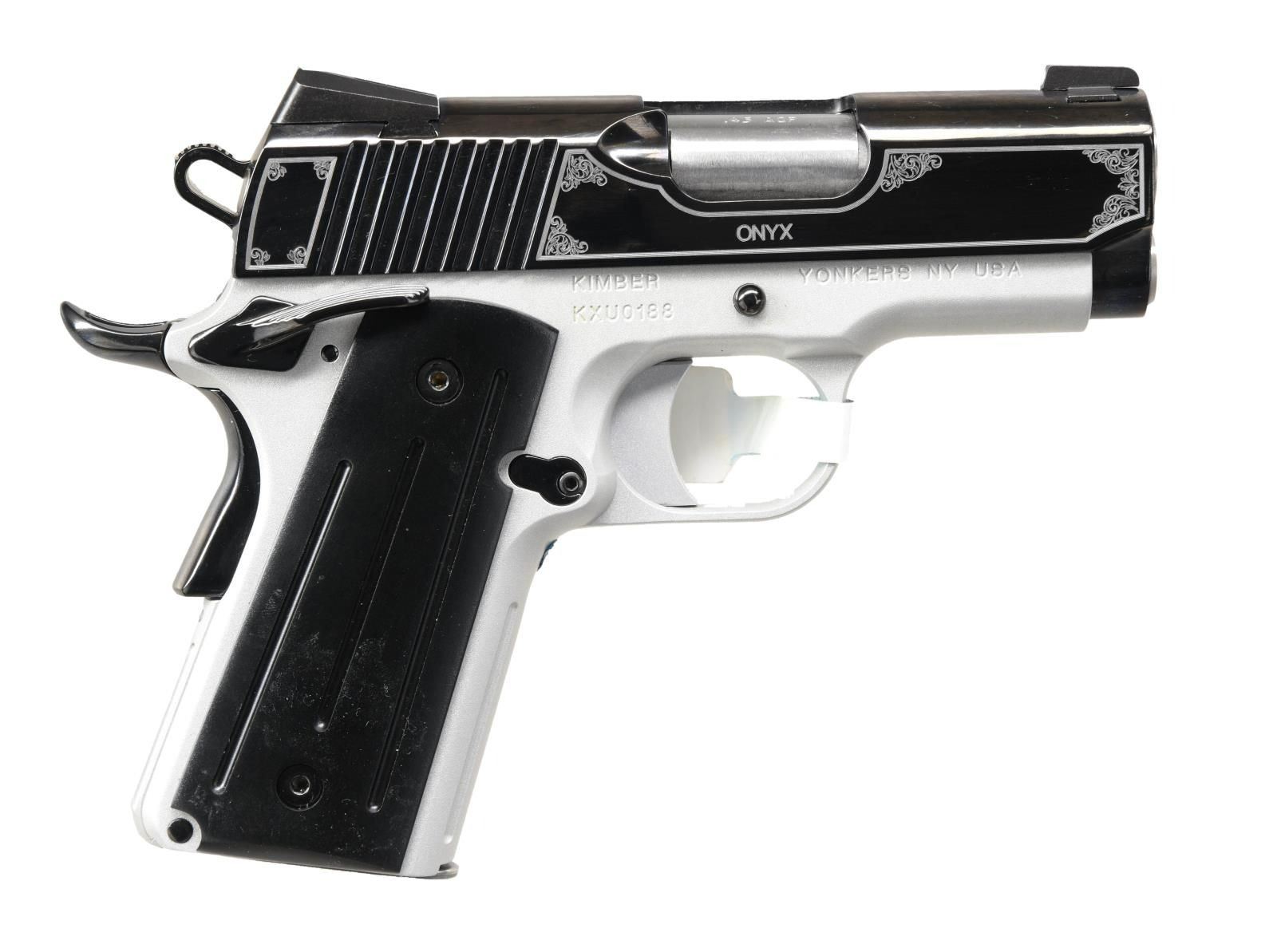 Cal. 45 ACP. S# KXU0188. Bbl. 3". Three dot night sights. Extended ambi safety. Extended beavertail grip safety. Rear slide serrations. Stainless frame. Black PVD coated slide w/ scroll accents. Factory hang tag still present. Black ball milled Micarta thin grips. MAGS: 1-6 rd. factory .UNATTACHED ACCESSORIES: factory hardcase matching numbered to gun w/ foam inserts, manual, cable lock, chamber flag, lubricant & paperwork. CONDITION: all aspects near excellent. PROVENANCE: The Collection of Gun Sport Ltd. owned by Jon R. Thomas. (23-3038/MJC). MODERN. $1,000-1,500.