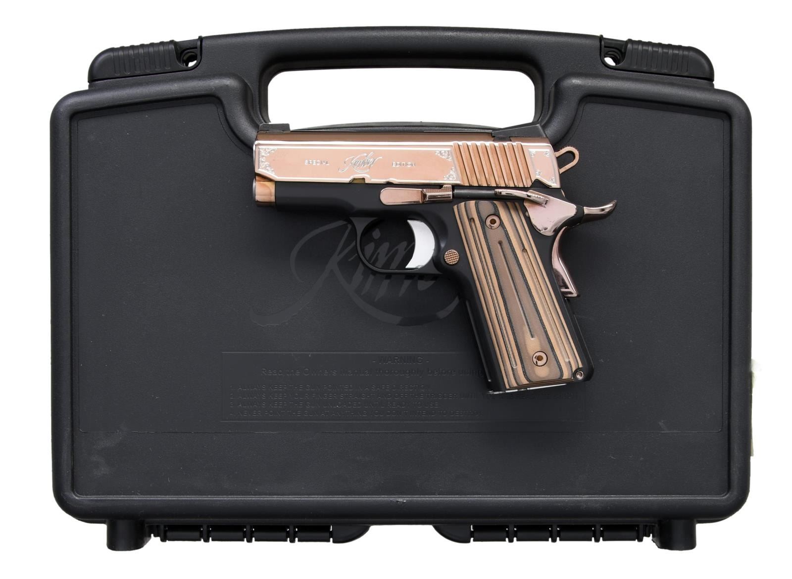 Cal. 9mm Luger. S# KXU5562. Bbl. 3". Three dot night sights. PVD rose gold-finished slide w/ floral accents. Slide release, mag. release, extended ambi safety, & beavertail grip safety also have a rose gold finish. Matte black finished frame. G10 grips. MAGS: 1-7 rd. UNATTACHED ACCESSORIES: matching-numbered factory hardcase w/ manual, cable lock, & paperwork. CONDITION: all aspects are near excellent. PROVENANCE: the collection of Gun Sport Ltd., owned by Jon R. Thomas. (23-4403/MJC). MODERN. $1,000-1,500.