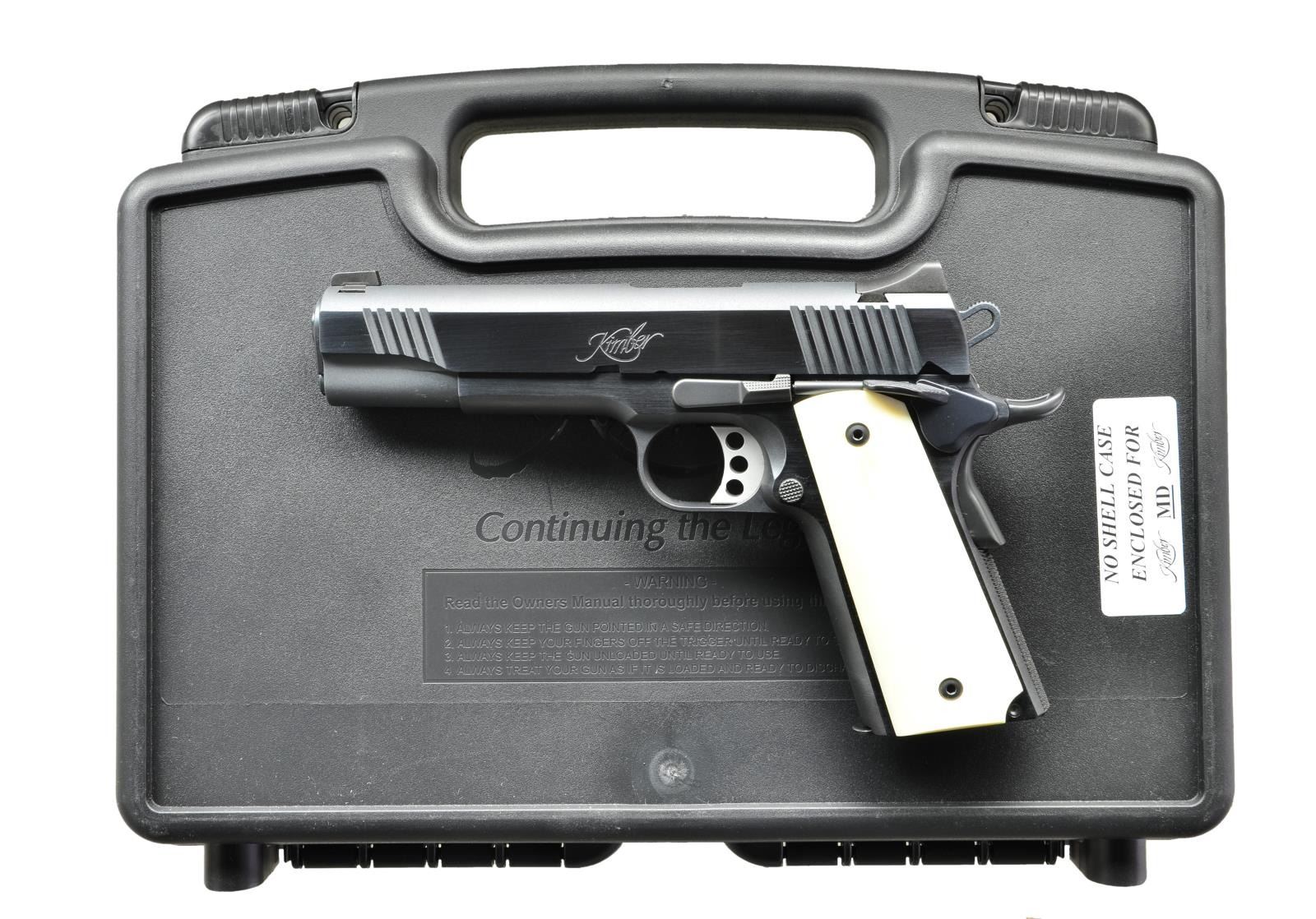 KIMBER ROYAL II SEMI AUTO PISTOL. Cal. 45 ACP. S# K423079. Bbl. 5”. Custom Shop mfg. with steel frame and slide with fixed low profile sights. Finish is a charcoal blue and the slide has serrations front and back. Features include a Commander style hammer, aluminum match grade trigger and checkered mainspring housing. Ambidextrous thumb safety and beavertail grip safety and solid bone grips. MAGS: 1-7 rd. factory. UNATTACHED ACCESSORIES: Factory black plastic hardcase serial numbered to the pistol, manual, safe chamber indicator, lock, bushing wrench, oil and paperwork. CONDITION: All aspects are near excellent, showing very light use only. Bore is near excellent, bright and strong. (22-2929/CW). MODERN. $800-1,200.