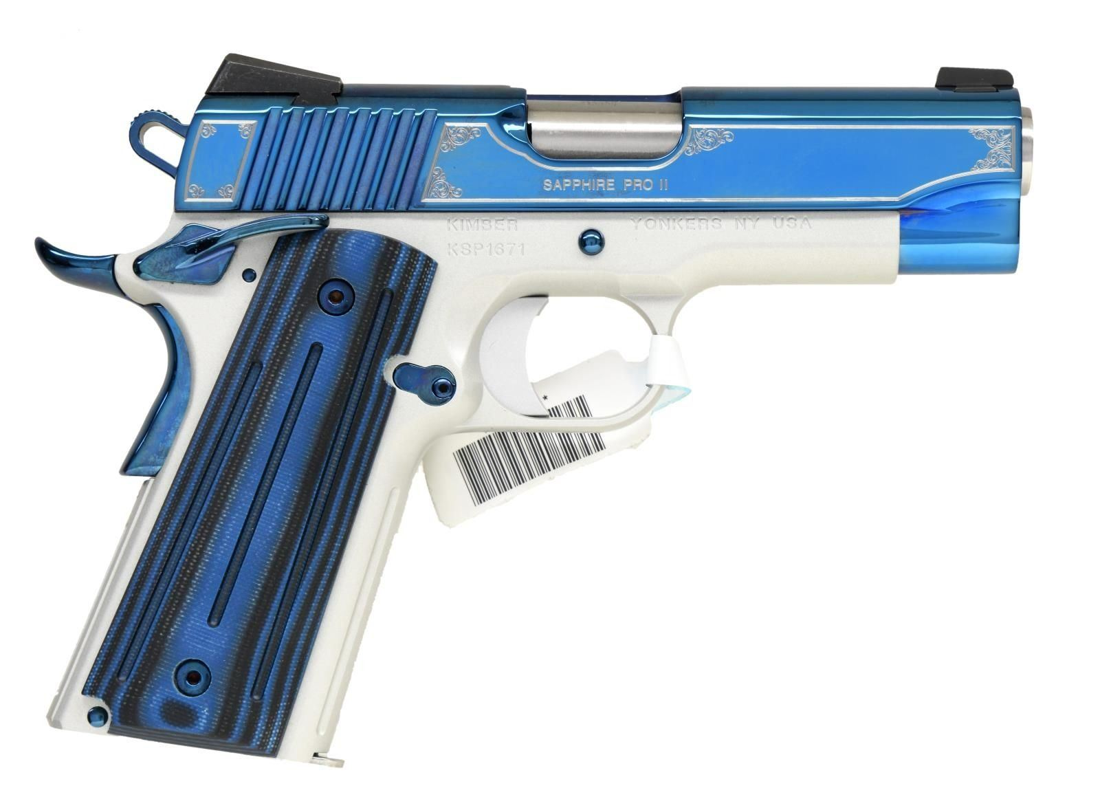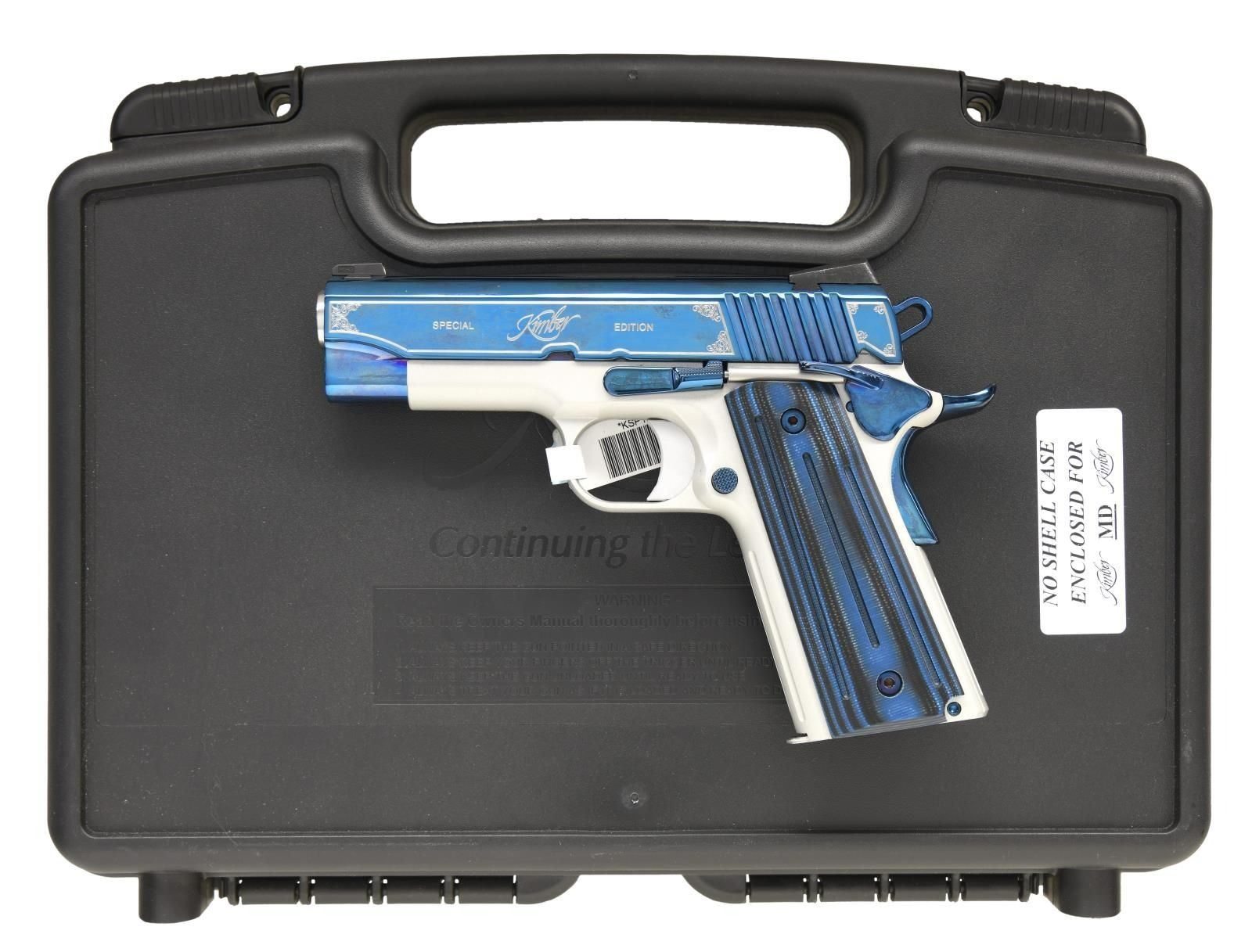 Cal. 9mm Luger. S# KSP1671. Bbl. 4". Three dot night sights. Bright blue PVD coated slide w/ rear serrations & floral accents. Extended ambi safety. Extended beavertail grip safety. Satin silver aluminum frame. Factory hang tag present on trigger guard. Ball milled thin blue grips. MAGS: 1-9 rd. factory. UNATTACHED ACCESSORIES: factory hardcase matching numbered to gun w/ foam inserts, manual, paperwork, cable lock, chamber flag & FP-10 lubricant sample. CONDITION: all aspects near excellent. PROVENANCE: The Collection of Gun Sport Ltd owned by Jon R. Thomas. (23-3053/MJC). MODERN. $1000-1500.
