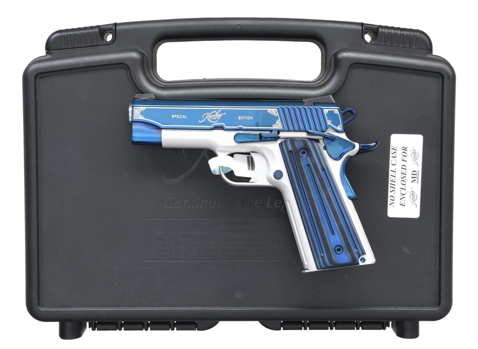 Cal. 9mm Luger. S# KSP1507. Bbl. 4". Three dot night sights. Extended ambi safety. Extended beavertail grip safety. Blue PVD-coated slide w/ floral accents. Satin silver frame. Ball-milled blue G10 grips. MAGS: 1-9 rd. UNATTACHED ACCESSORIES: matching-numbered factory hardcase w/ manual, paperwork, & cable lock. CONDITION: all aspects are near new, in the box. PROVENANCE: the collection of Gun Sport Ltd., owned by Jon R. Thomas. (23-3052/MJC). MODERN. $1000-1500.