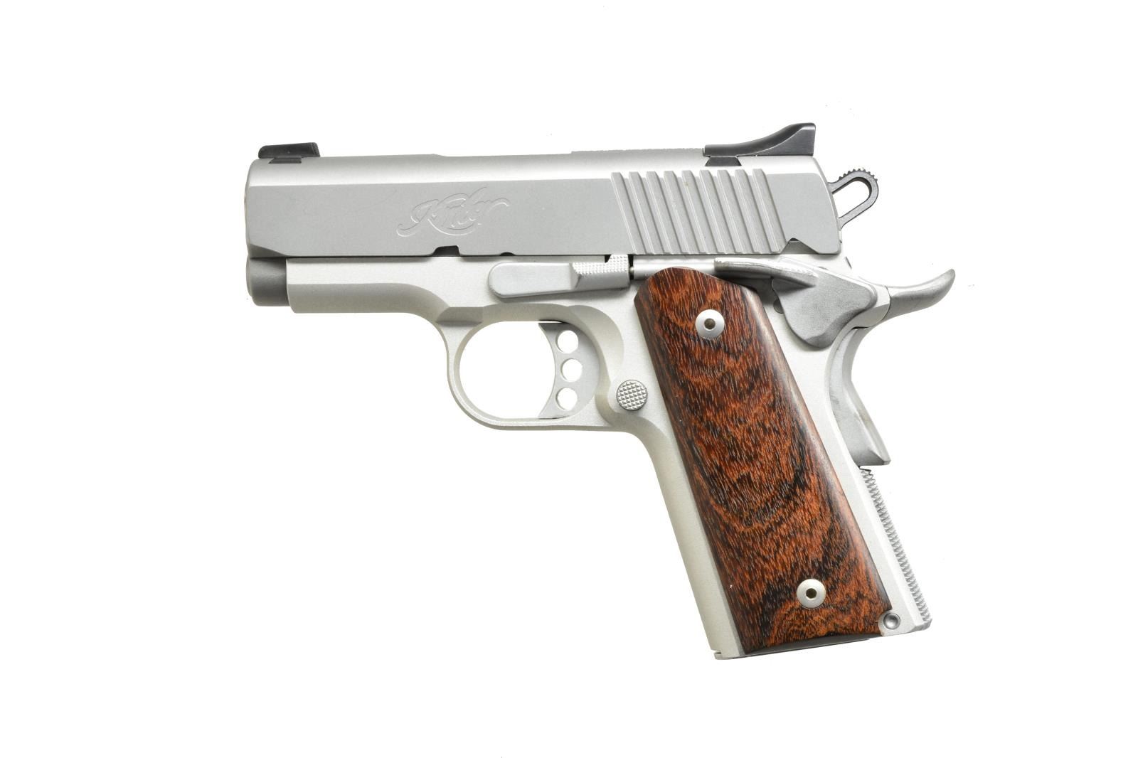 Cal. 45 ACP. S# KU06549. Bbl. 3”. Low profile sights. Skeleton hammer. Extended beavertail safety. Lightweight adj. trigger. Smooth walnut grips. Checkered flat mainspring housing. MAGS: 1-7 rd. UNATTACHED ACCESSORIES: matching numbered Kimber black plastic box. CONDITION: overall near excellent w/ some light wear to grip safety & a few scattered light handling marks. Near excellent grips. Near excellent shiny bore w/ very nice rifling. (20-3697/ZAL). MODERN. $500-700.