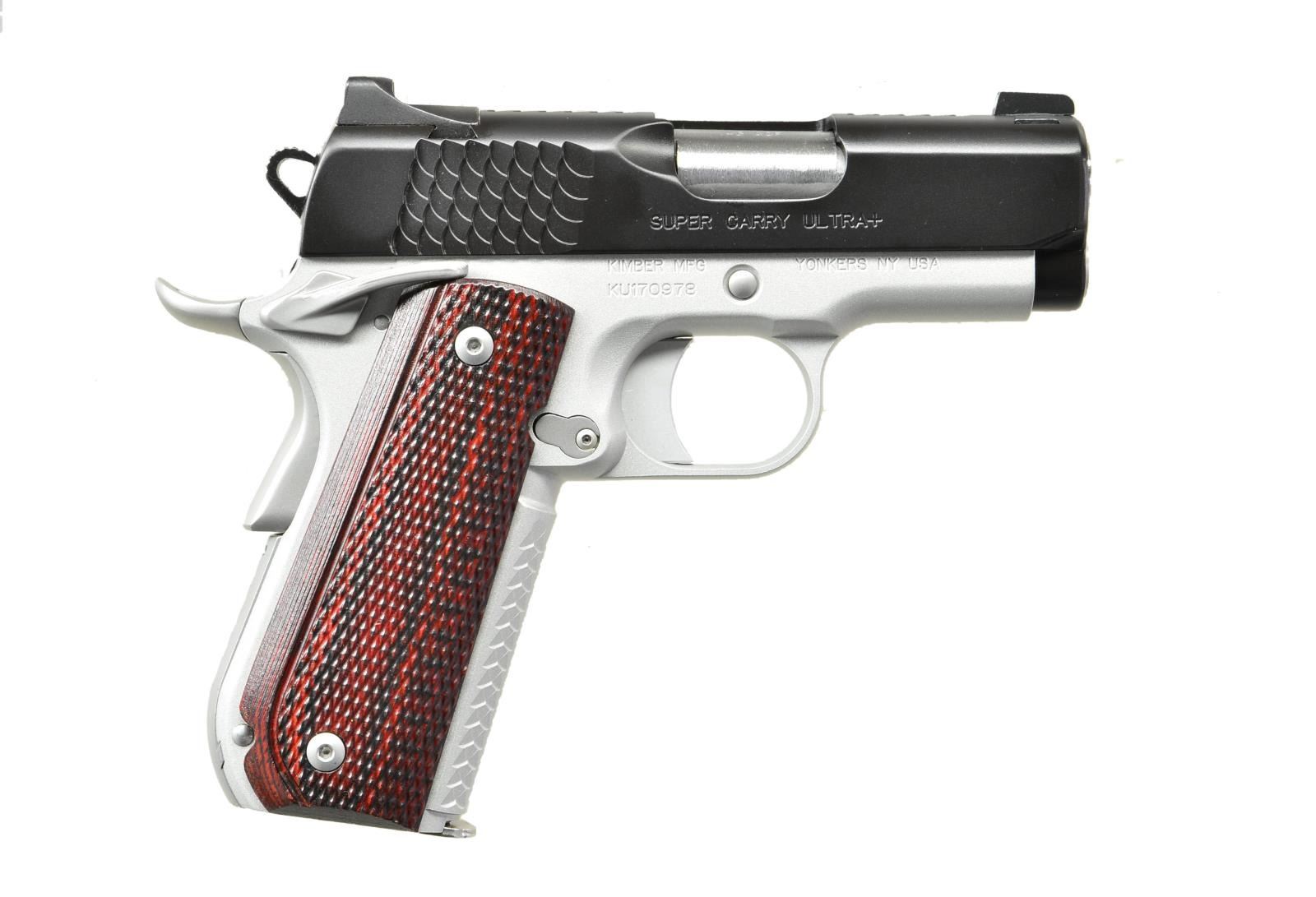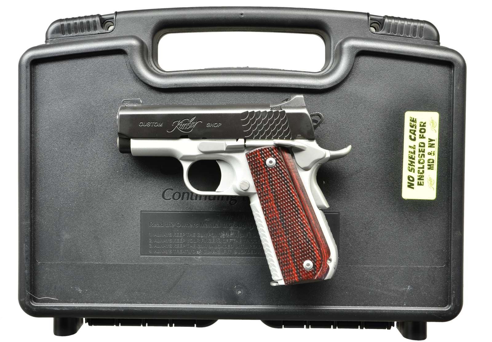 KIMBER SUPER CARRY ULTRA PLUS SEMI AUTO PISTOL. Cal. 45 ACP. S# KU170978. Bbl. 3”. Custom shop mfg. with two tone finish; aluminum frame with blued slide that holds MH3 night sights that still glow, albeit faintly. Slide has scales on top and sides and both gripstraps are scaled as well. Round heel frame and ambidextrous thumb safety, beavertail grip safety and Commander style hammer. MAGS: 1-7 rd. KimPro TacMag. UNATTACHED ACCESSORIES: Factory black plastic hardcase serial numbered to the pistol with manual, safe chamber indicator, lock, Allen wrench, oil and paperwork. CONDITION: All aspects are near excellent, showing little evidence of use. Bore is near excellent, bright and strong. (22-2972/CW). MODERN. $800-1,200.
