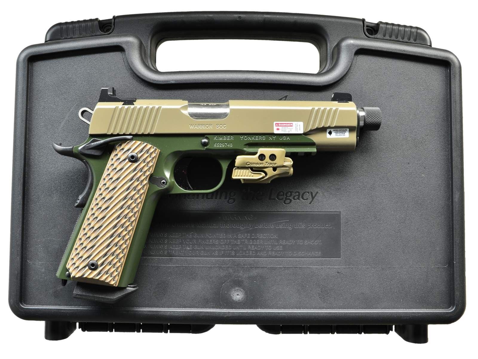 Cal. 45 ACP. S#K529748. Bbl. 5" stainless steel, match grade w/ stainless steel match grade bushing, threaded w/ knurled thread protector. A tough 1911 design w/ all the accessories needed for work and play. Steel slide w/ front & rear serrations finished in dark earth KimPro II coating. High profile night sights. Steel frame finished in dark green KimPro II coating w/ accessory rail, currently sporting Crimson Trace compact laser. Bevelled mag-well & lanyard loop. Solid aluminum, match grade trigger. Heavily textured G10 Kimber grips. Extended ambidextrous thumb safety. Bumped & textured grip safety. Checkered mainspring housing. MAGS: Factory 7rd. UNATTACHED ACCESSORIES: Black plastic numbered factory case & paperwork. CONDITION: All aspects indicate as new. (22-2959/JZ). MODERN. $700-1,100.