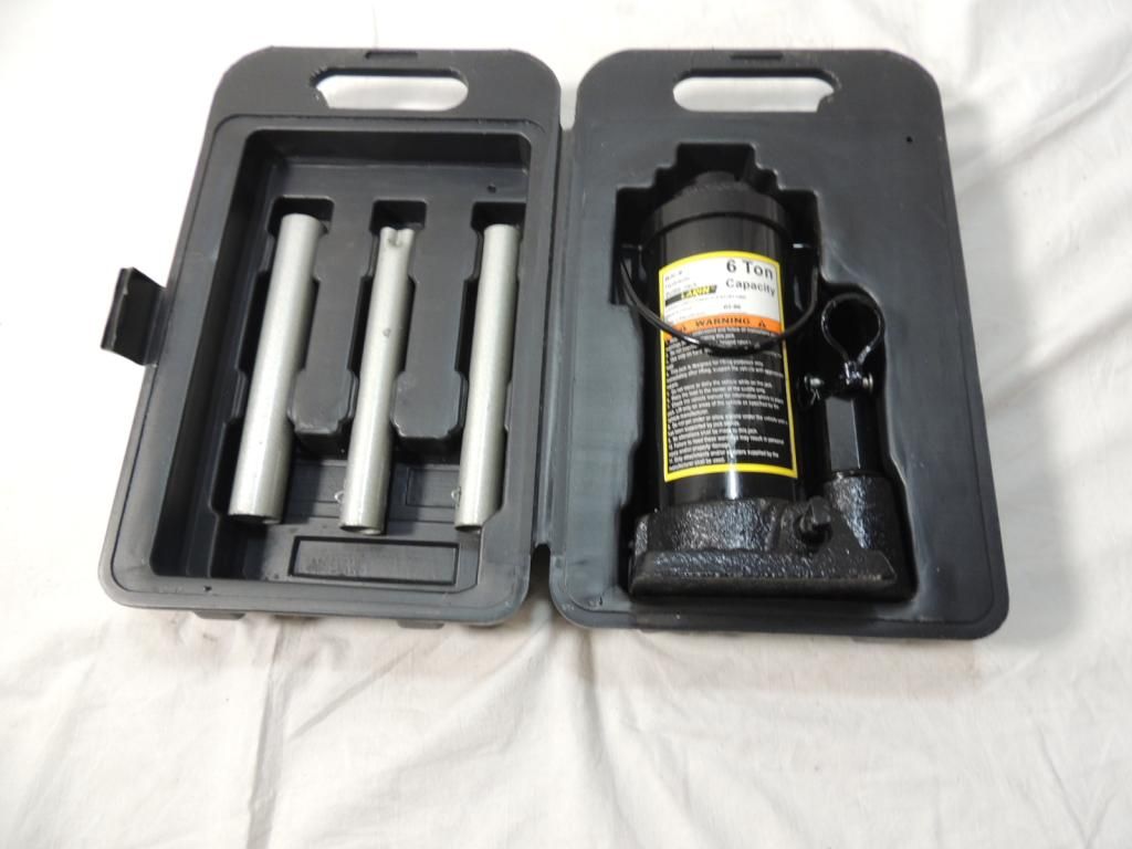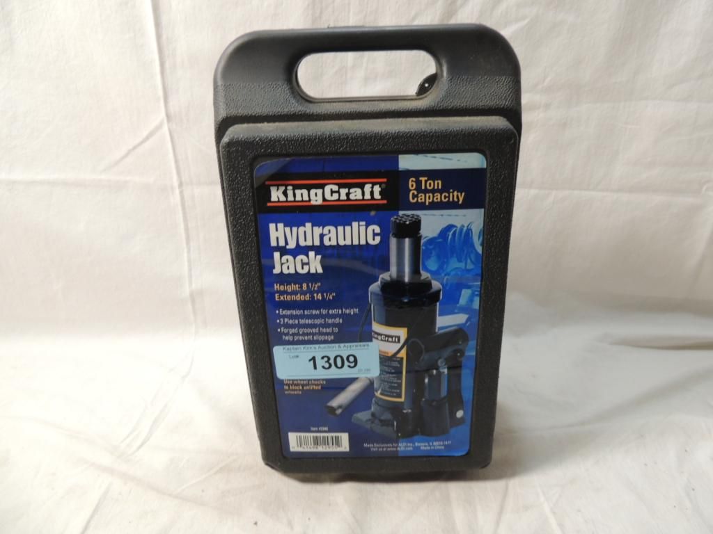 KING CRAFT HYDRAULIC JACK 6 TON CAPACITY. HEIGHT 8 1/2" EXTENDED 14 1/4" EXTENSION SCREW FOR EXTRA HEIGHT 3 PIECE TELECOPIC HANDLE FORGED FROOVED HEAD TO HELP PREVENT SLIPPAGE. AS SHOWN. SEE PHOTO FOR MORE DETAILS