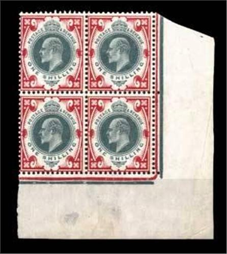 1902-10 1s dull green and pale carmine on chalk surfaced paper (SG spec M46 (2)) SE cnr marginal block of four, one large part o.g. others u/m