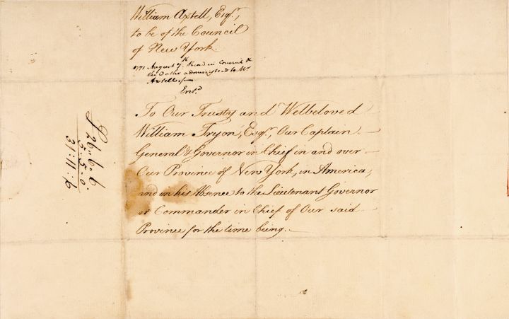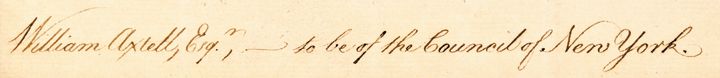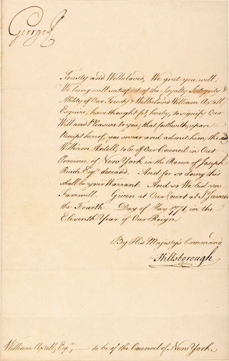 May 4, 1771-Dated Pre-Revolutionary War, Manuscript Document Signed, “George R,” as King, two pages, measuring 8” x 12.5” and is Choice Extremely Fine. In this historic original document, King George officially Appoints William Axtell as Council of the Province of New York. Axtell (1720-1795) can be located as listed in “Biographical Sketches of Wealthy Men of the Colonial Era in New York.” He gained a sinister reputation during the Revolutionary War. As a member of the Governor's Council in 1776, Axtell was Commissioned Colonel and Commander of a Loyalist Regiment known as the Nassau Blues. That Loyalist unit was much feared for its exaltations against those who embraced the Patriot cause. His headquarters was the county seat, “Melrose Hall,” which allegedly became the scene of tortured rebel prisoners, whilst still retaining its fame for lavish entertainment, now just limited to the Loyalist Elite.