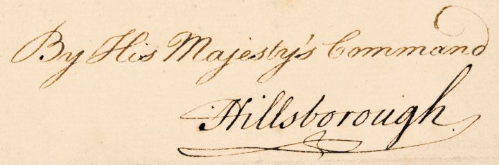 This document is nicely Signed at the top left “George R” in brown ink, and is also Countersigned at the bottom by Lord Hillsborough. There is a second integral page which bears several dockets and additional endorsements. Overall this impressive document is very clean, well written and easily readable, being in choice condition. There is some trivial expected scattered light tone, light storage folds, and reinforcement to edges of second page. Document by King George III which have a direct connection to the American Colonies and especially the Revolutionary War, are very scarce and significantly more rare and valuable to collectors.