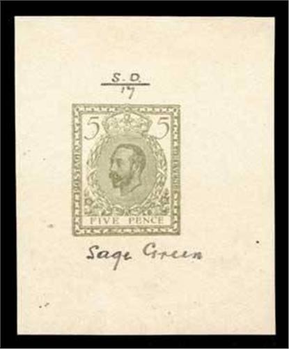 1910-12 5d Hentschel essay in sage green on un-wmk'd gummed paper, with m/s "S.O./17" above and "sage green" below design, large part o.g.