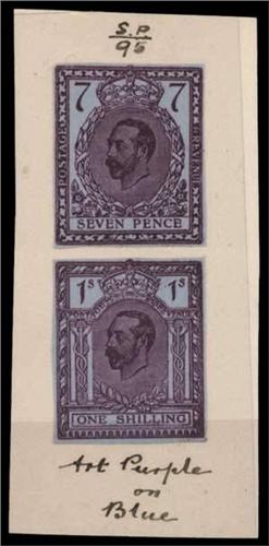 1910-12 7d and 1s Hentschel essay in art purple on blue with m/s "S.P./95" above and "Art Purple on blue" below design, light fold between stamps