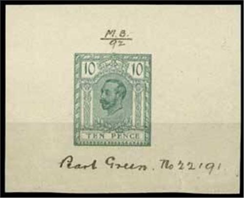 1910-12 10d Hentschel essay in pearl green on un-wmk'd gummed paper, with m/s "M.B./92" above and "pearl green No 22191" below design, large part o.g.