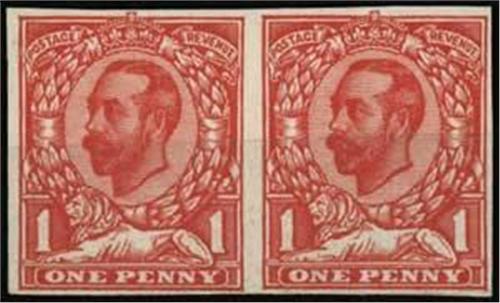 1911-12 1d die b, horiz imperf plate proof pair in carmine on chalky paper