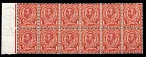 1912 (Jan) 1d aniline scarlet left hand marginal block of twelve (6 x 2) from plate 16a with variety no cross on crown R8/3 (SG 343a) scarce multiple fine u/m, photocopy of 1998 BPA Certificate