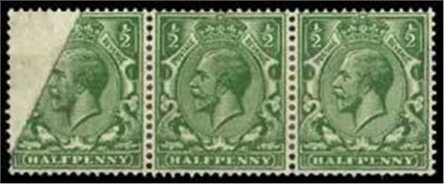 1924-26 ½d green (SG 418var) horiz strip of 3, l/h stamp showing partial (30% at u/l) omission of colour due to a diagonal pre-printing paper fold, re-enforced with hinges but a striking var, part o.g.