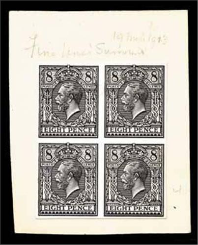 1912-24 8d Miller and Motley trial black with evenly shaded background, block of four from the special plate on white glazed card, mounted on card with pencil annotation "Fine Lines Surround/19 Mch 1913" fine