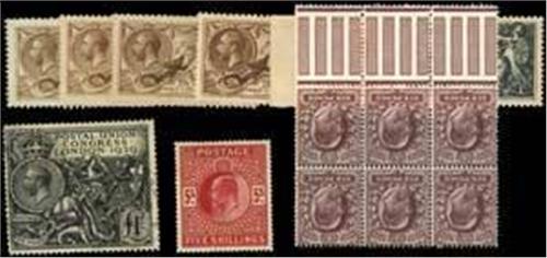 Small group incl 1915 DLR 2s 6d yellow-brown (SG 406) x2 (one toned) and 2s 6d pale brown (SG 407) (toned) large part o.g., 1934 re-engraved set of 3 (SG 450/52) u/m but rather toned, 1929 £1 PUC good cds used, also KEVII 1902-10 5s bright carmine (SG 263