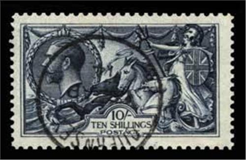 1913 Waterlow 10s indigo-blue (SG 402) wrinkle and one shortish perf, otherwise fine used by Guernsey cds, cat £375