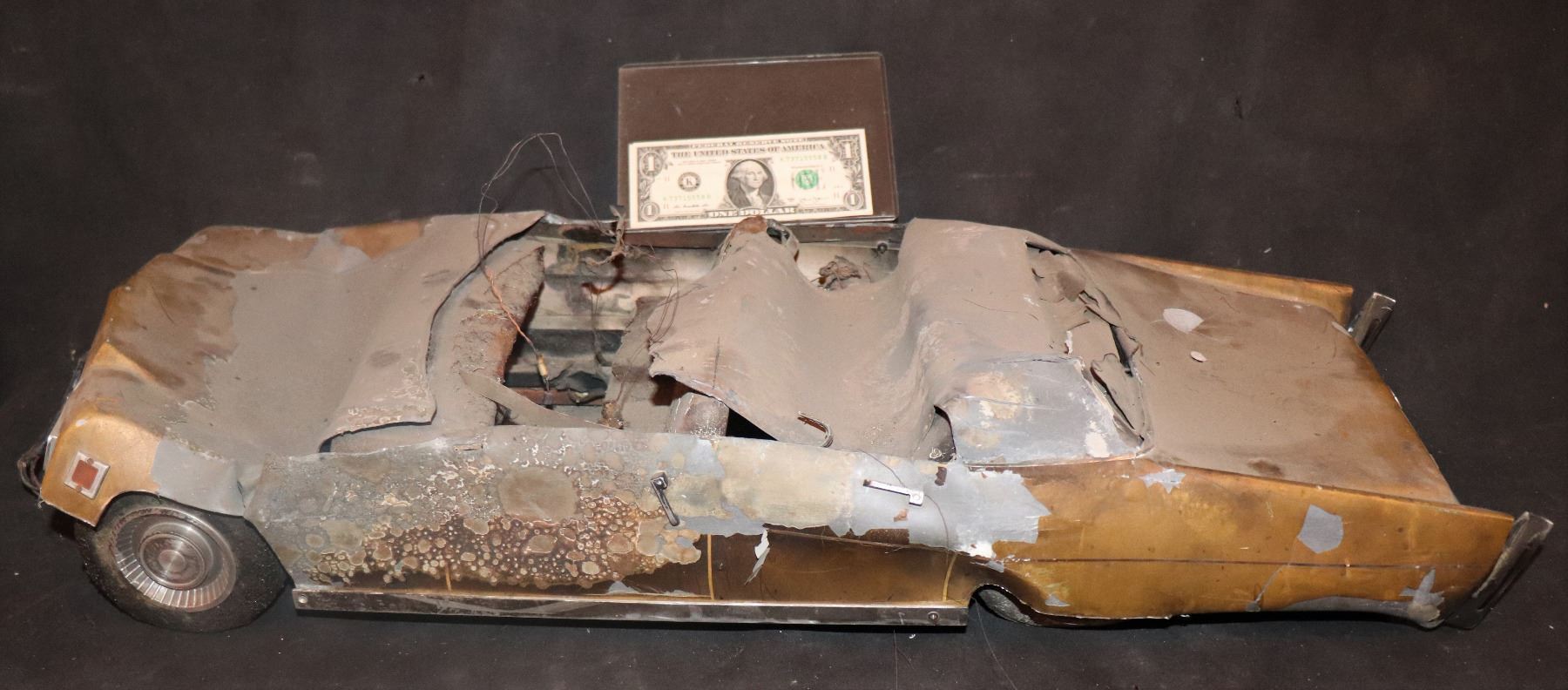 KING KONG 1976 CRUSHED AND BURNED LARGE SCALE MINIATURE LEAD CADILLAC.
