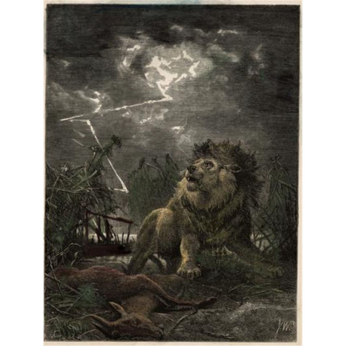 KING OF BEASTS from a collection of rare prints, many one of a kind in that they are hand-colored. Each print from the collection were literally discovered in the attic of a South Carolina pre-civil war mansion. All of the prints are in excellent condition, the hand-coloring as vivid as the prints themselves are rare. Each print was made by carving the scene, in reverse, into a wood block. Rare, fine condition and below market value with an estimate of $200 - $400. Mearsures 12.5in x 9.5in MWF1283