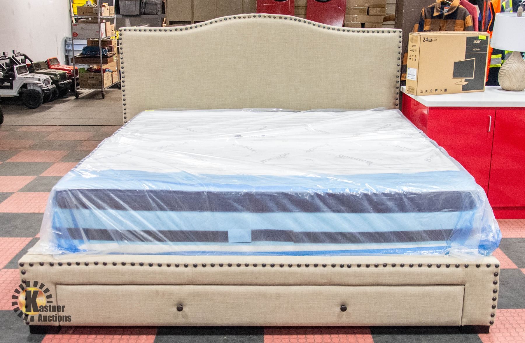 SIDE RAILS AND LARGE ROLL-OUT DRAWER AT FOOT OF BED - BED FRAME WITH DUAL METAL BRACES FOR SLATS, LIGHT BROWN FABRIC WITH NAILHEAD ACCENT (88"L X 83"W X 55"H - TOP OF HEADBOARD) **MATTRESS IS NOT INCLUDED- SOLD SEPARATELY*** **ALL ITEMS MUST BE REMOVED BY 5PM SATURDAY, JULY 1ST 2023. ALL REMAINING ITEMS WILL BE SUBJECT TO A $6.00 PER DAY STORAGE CHARGE. ANY ITEMS REMAINING AFTER MONDAY, JULY 17TH, 2023 WILL BE CONSIDERED FORFEITED. NO REFUNDS WILL BE ISSUED FOR FORFEITED ITEMS. TO SCHEDULE A PICK UP APPOINTMENT CLICK HERE
