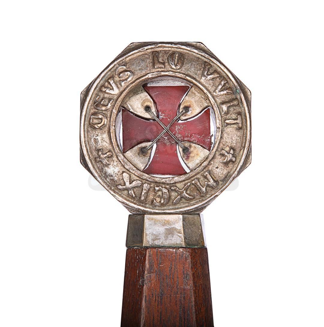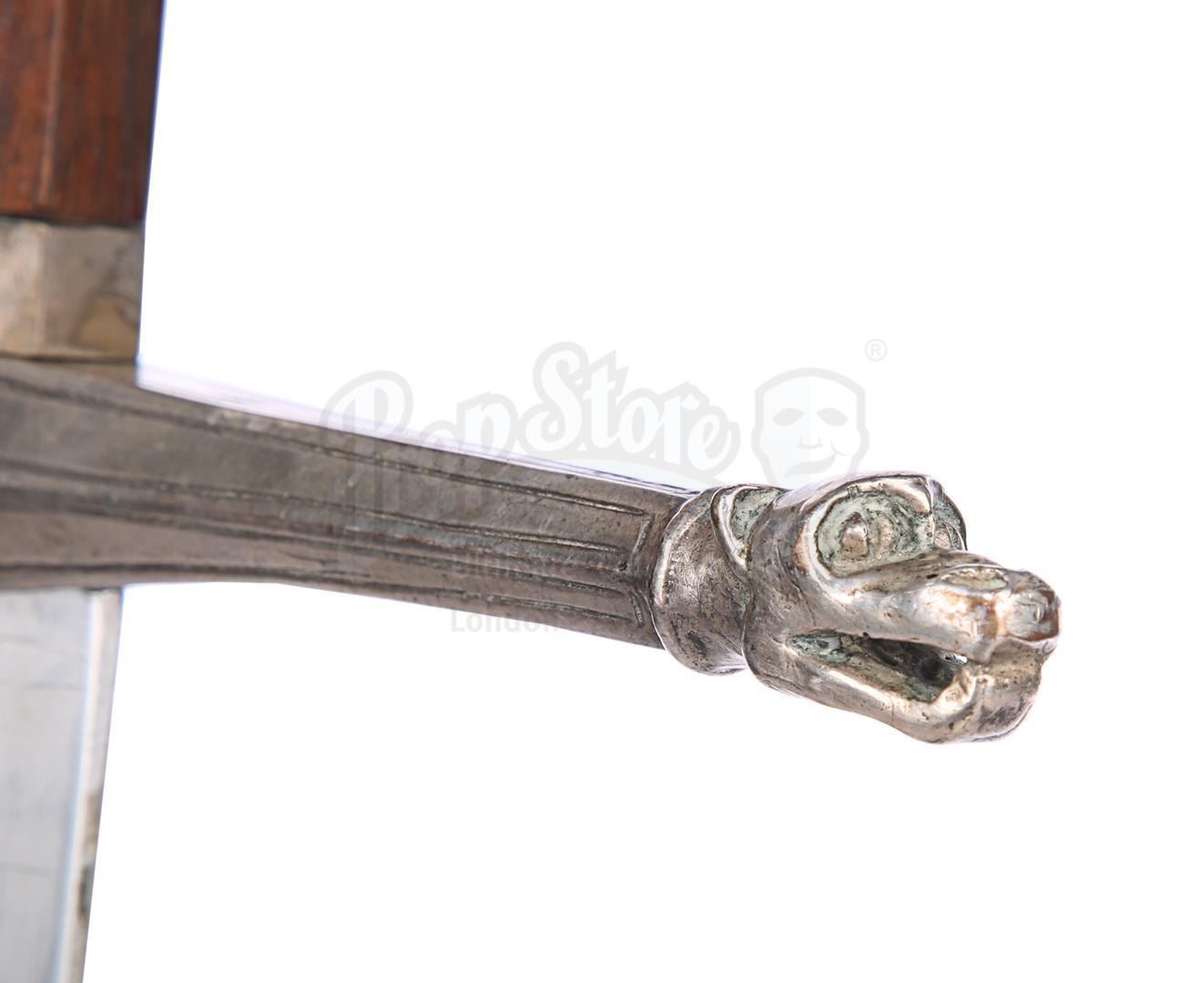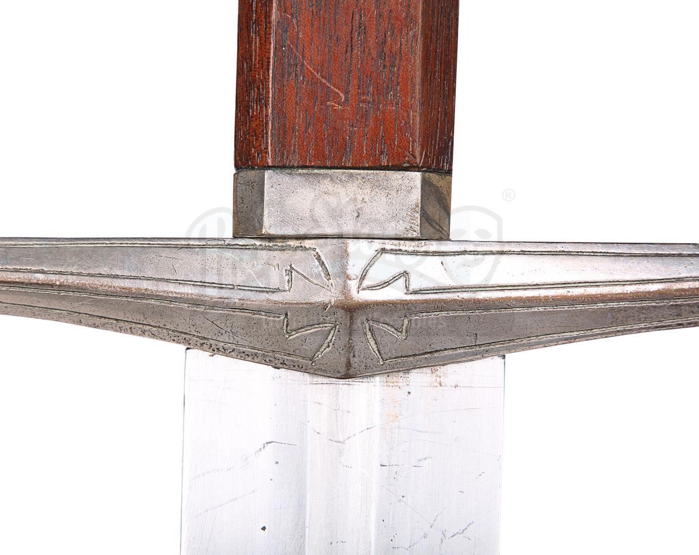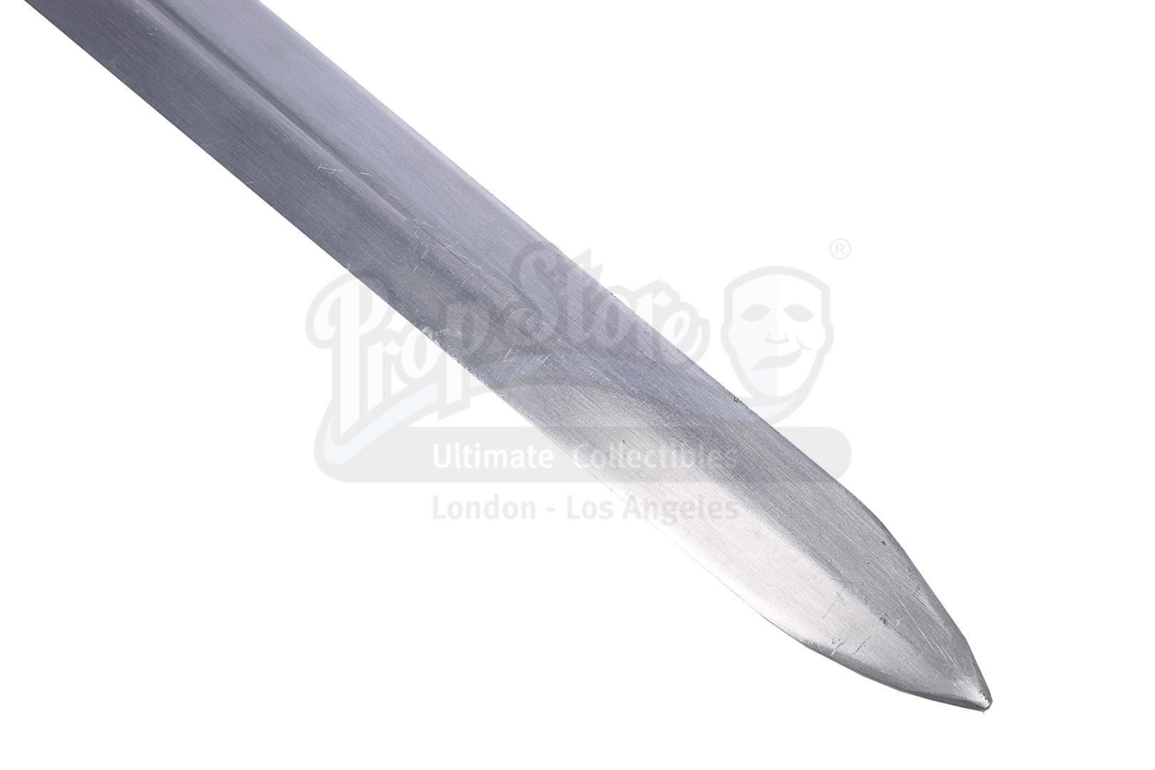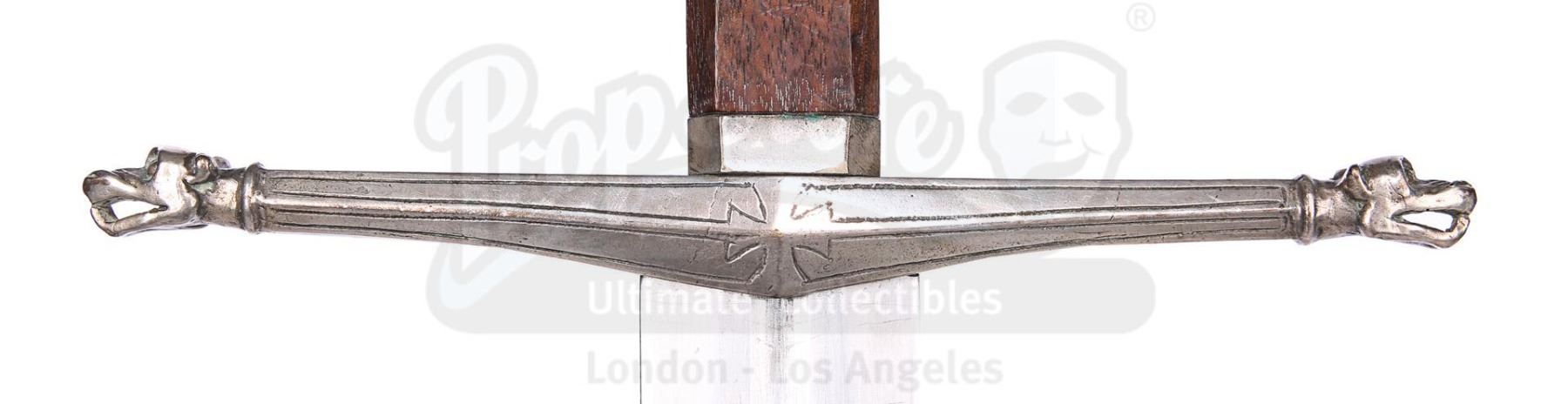 The sword is metal with a wooden hilt. Its metal pommel features the cross of St George and its metal guard is adorned with a dog's head at each end. Two short metal chains are looped around the hilt, on either side of a leather grip. The sword is intentionally distressed to look well used, and there are small nicks and dents along the length of the blade, giving the impression it has been used in combat. There is additional wear from production use and age, including scuffing and scratching, and some slight discolouration around the pommel and dog's heads. Dimensions: 115 cm x 25 cm x 3 cm (45 1/4" x 9 3/4" x 1 1/4")