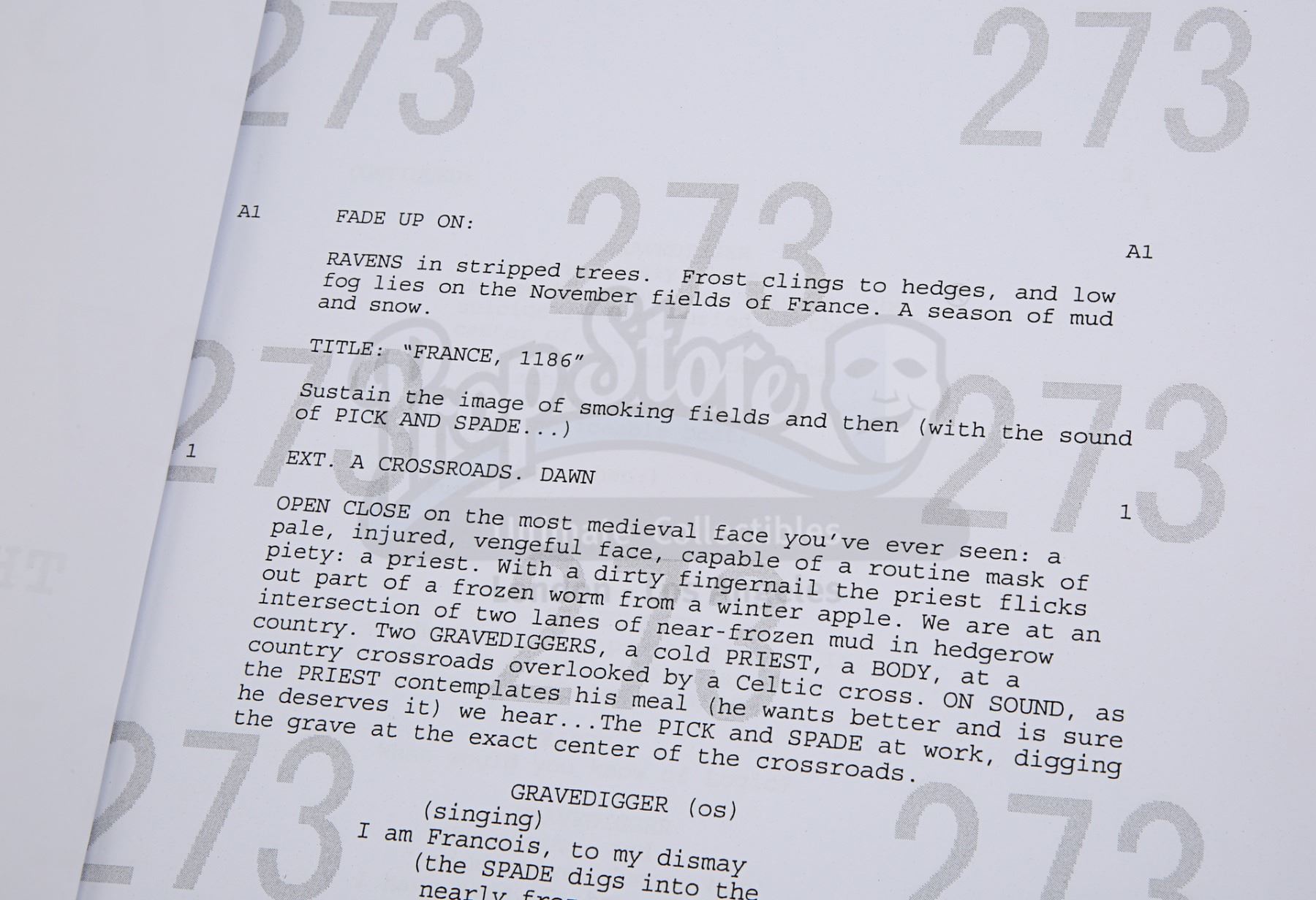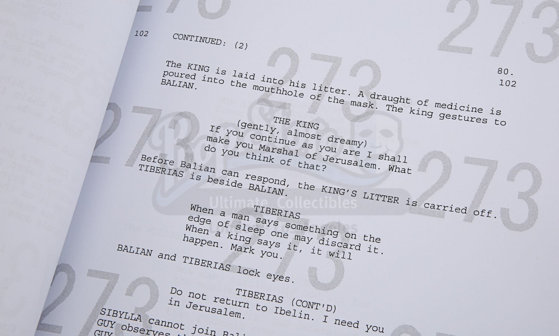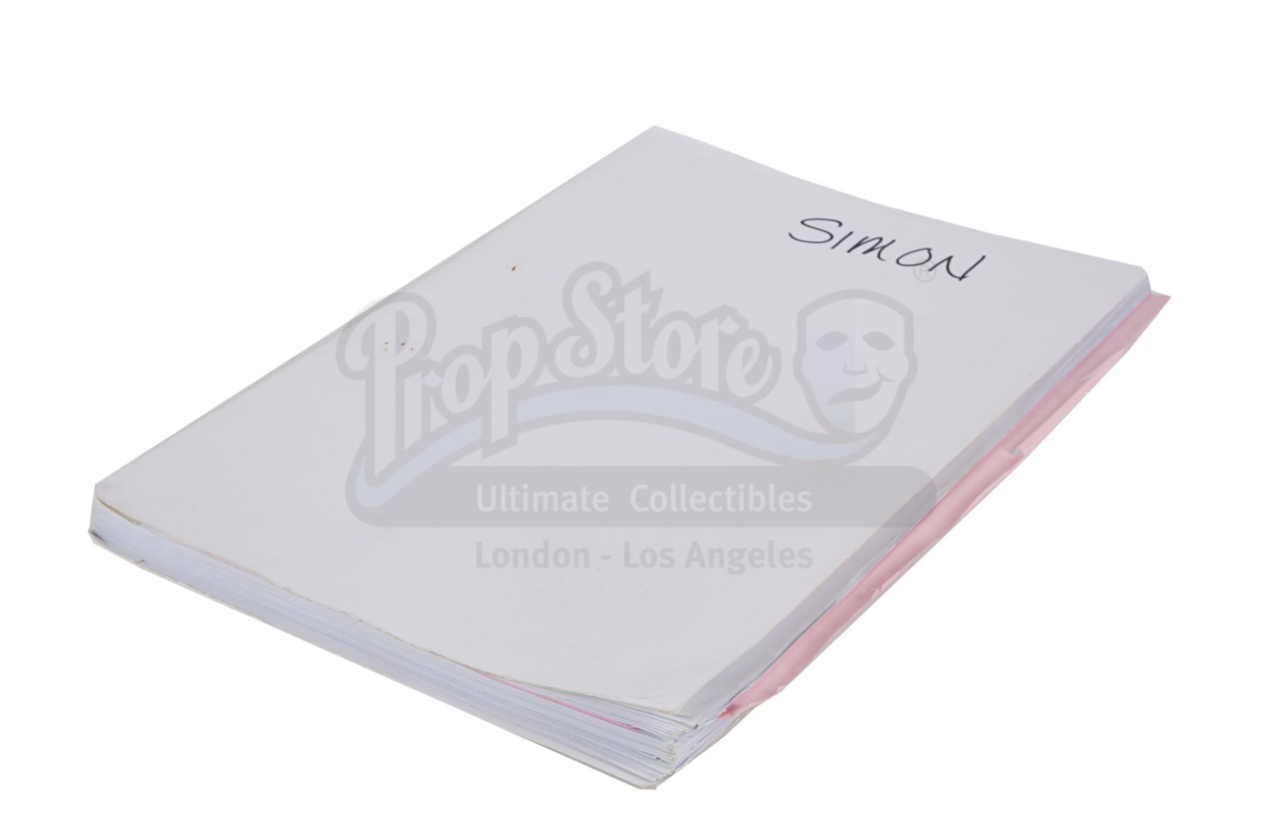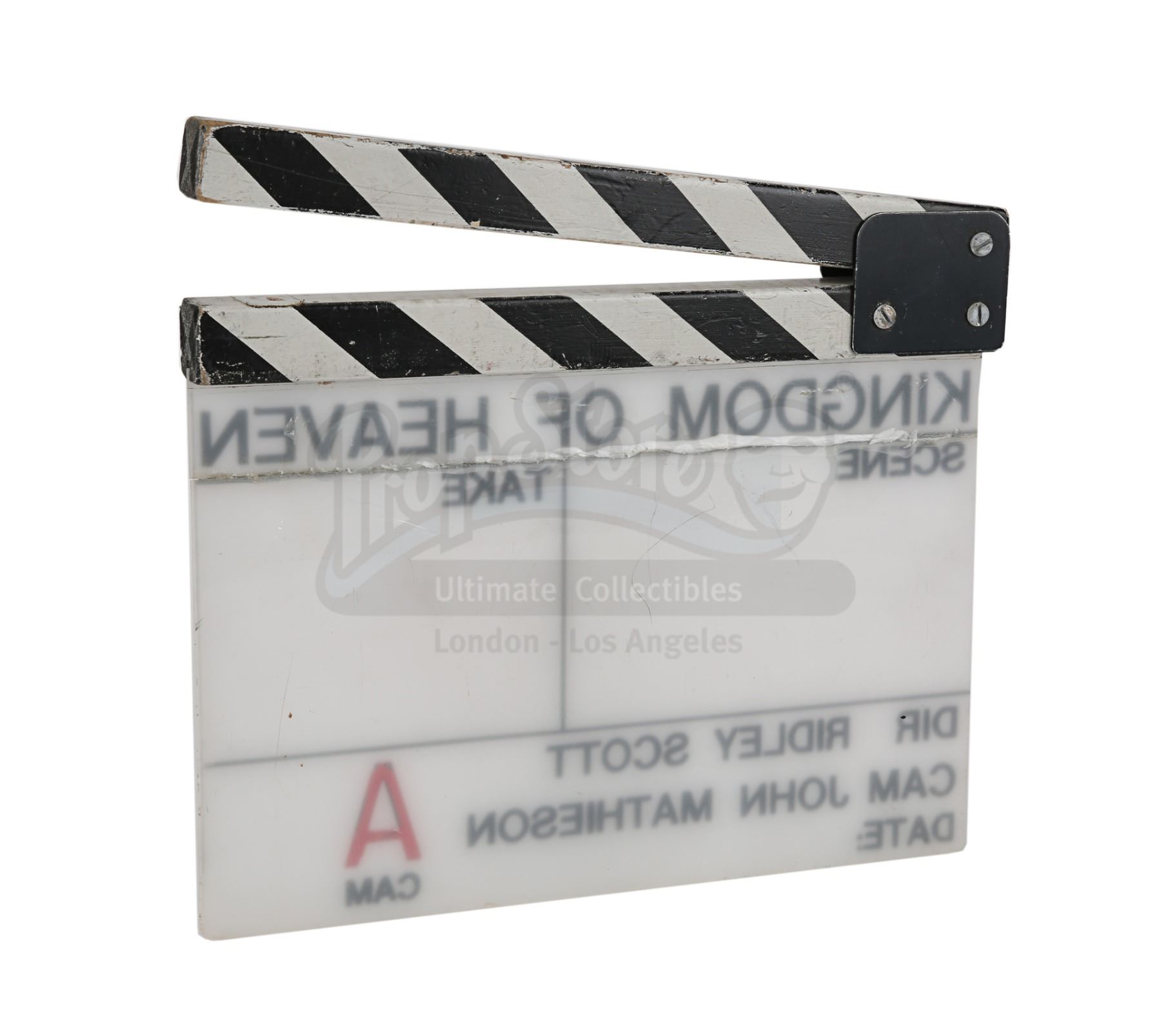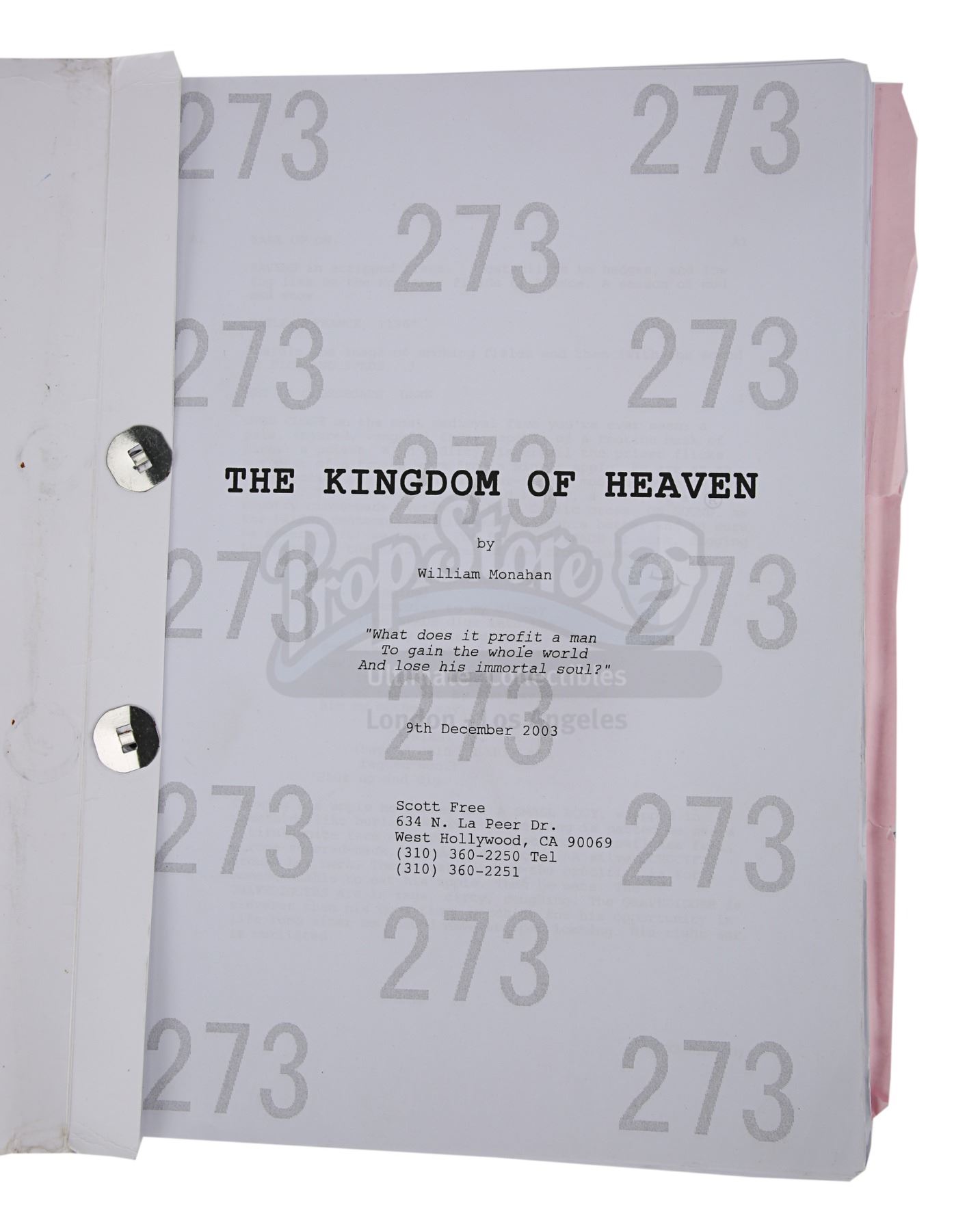 The clapperboard is made of white acrylic with wooden clapper sticks and a metal hinge. The film's title, as well as the names of director Ridley Scott and cinematographer John Mathieson, are present on the board. The script, credited to William Monahan, is 124 pages long, including the title page, with a pink draft copy of page 25 slipped in. It is bound between two white card covers with metal fasteners, and "273" is watermarked across each page multiple times. "Simon" is handwritten in black pen on the cover.