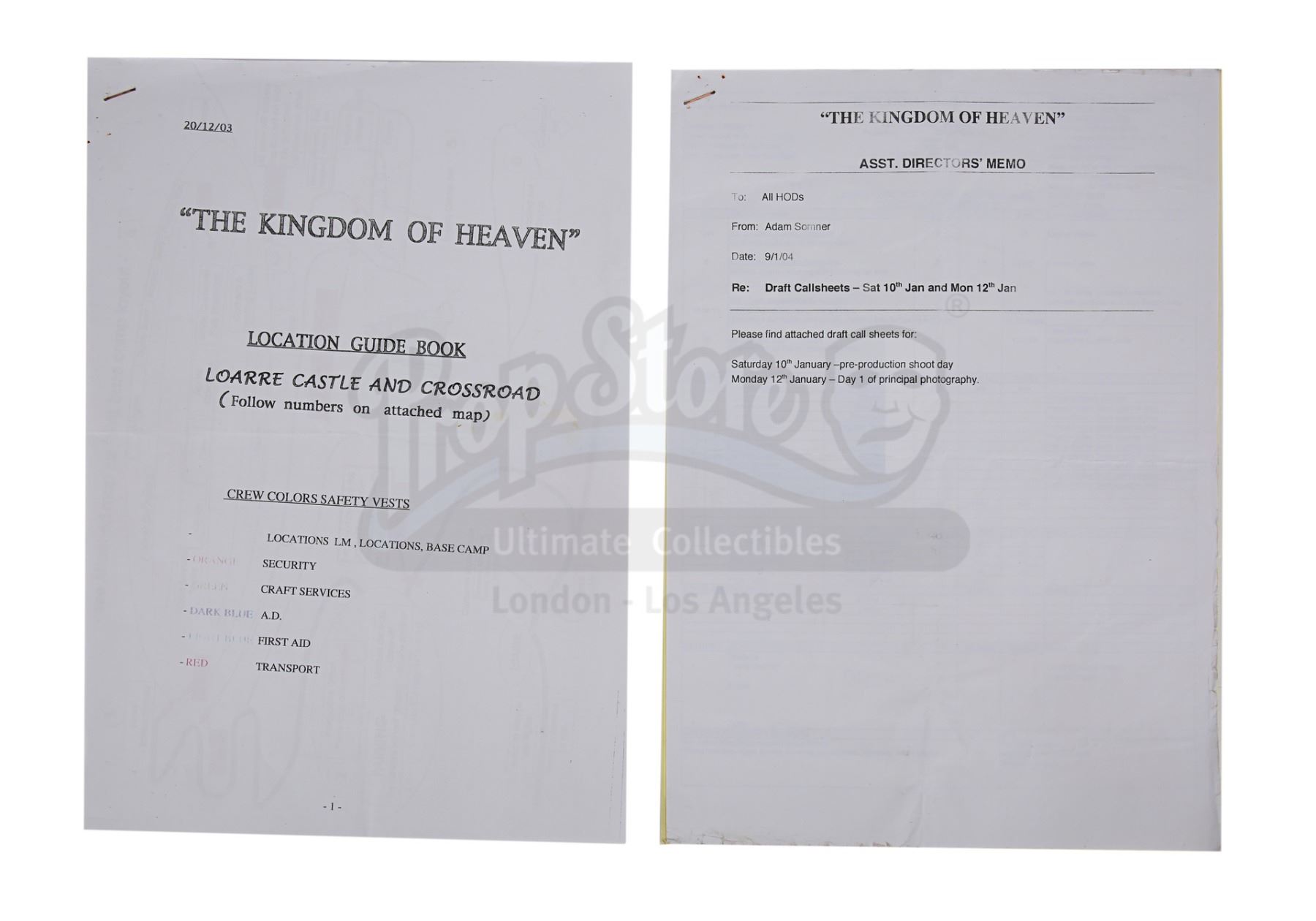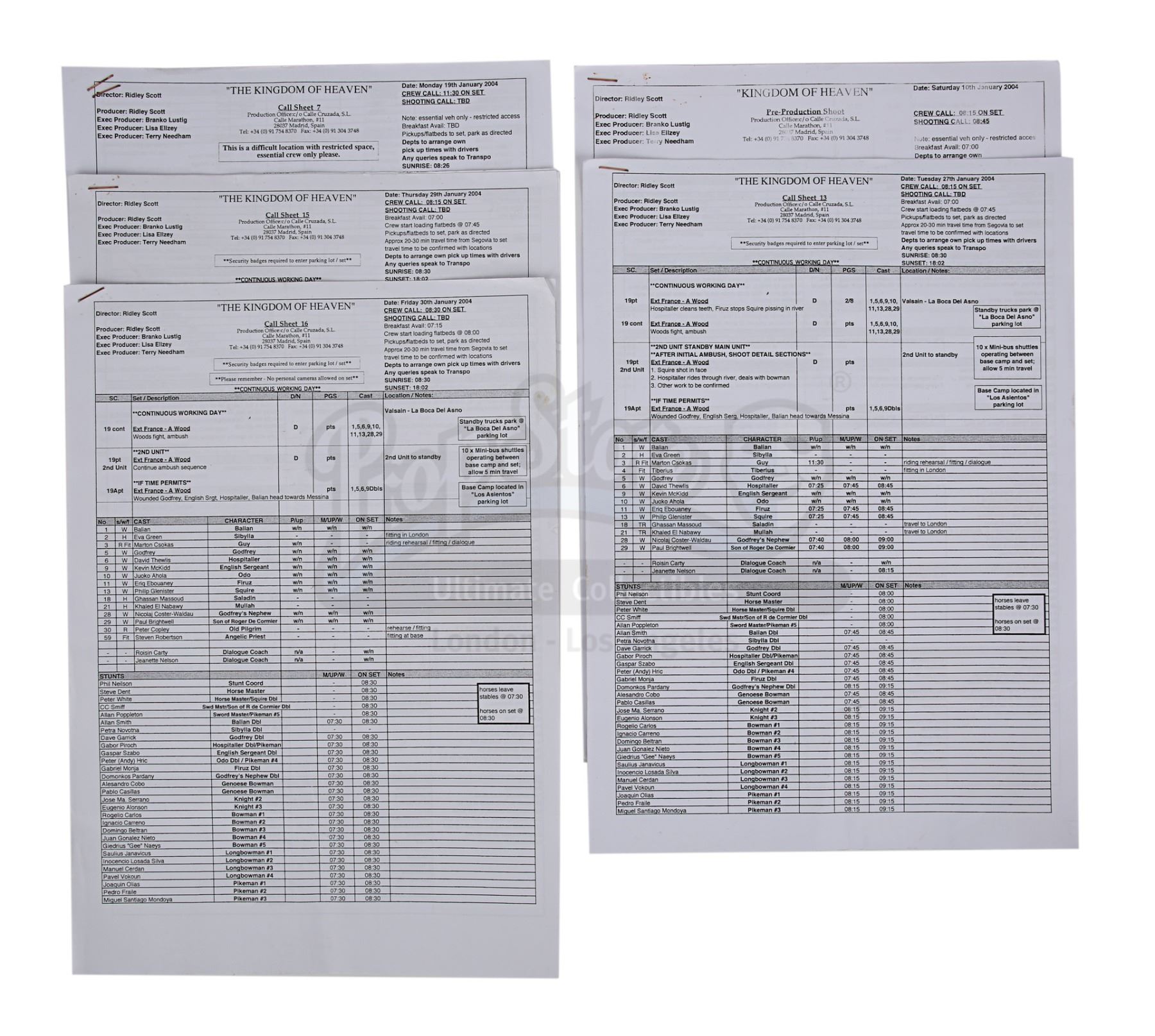 KINGDOM OF HEAVEN (2005) - Clapperboard, Shooting Script, Storyboards, Call Sheets and Memos