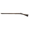 Cal. 52. NSN. Bbl. 37 3/4" octagon. Dovetail mounted brass blade front sight w/ fixed V notch rear sight. Side lug bolster. Engraved trade lock marked "KINGSLAND & Co. WARRANTED". Plain brass trigger. Wedge fastened full length curly maple cheek piece stock. Rectangular lid pierced segmented brass patchbox. Other brass fittings include crescent buttplate, trigger guard, faceted thimble, 2 faceted pipes & nose cap. Stock features a checkered wrist w/ relief carving at lower portion of cheek piece. Top of wrist has German silver oval escutcheon for installation of a missing lollypop style rear sight. WEIGHT: 9 lbs, 3.2 ozs. CONDITION: metal parts have a mottled brown patina showing heavy pitting at breech. Wood has a worn appearance w/ dents & handling marks w/ cracks in sideplate area. Area above lock plate shows added wood repairs. Forearm section shows large chips near nose cap. Lock will not hold in cocked position. Lightly pitted bore retains good rifling. (01-22794/DS). ANTIQUE. $600-800.