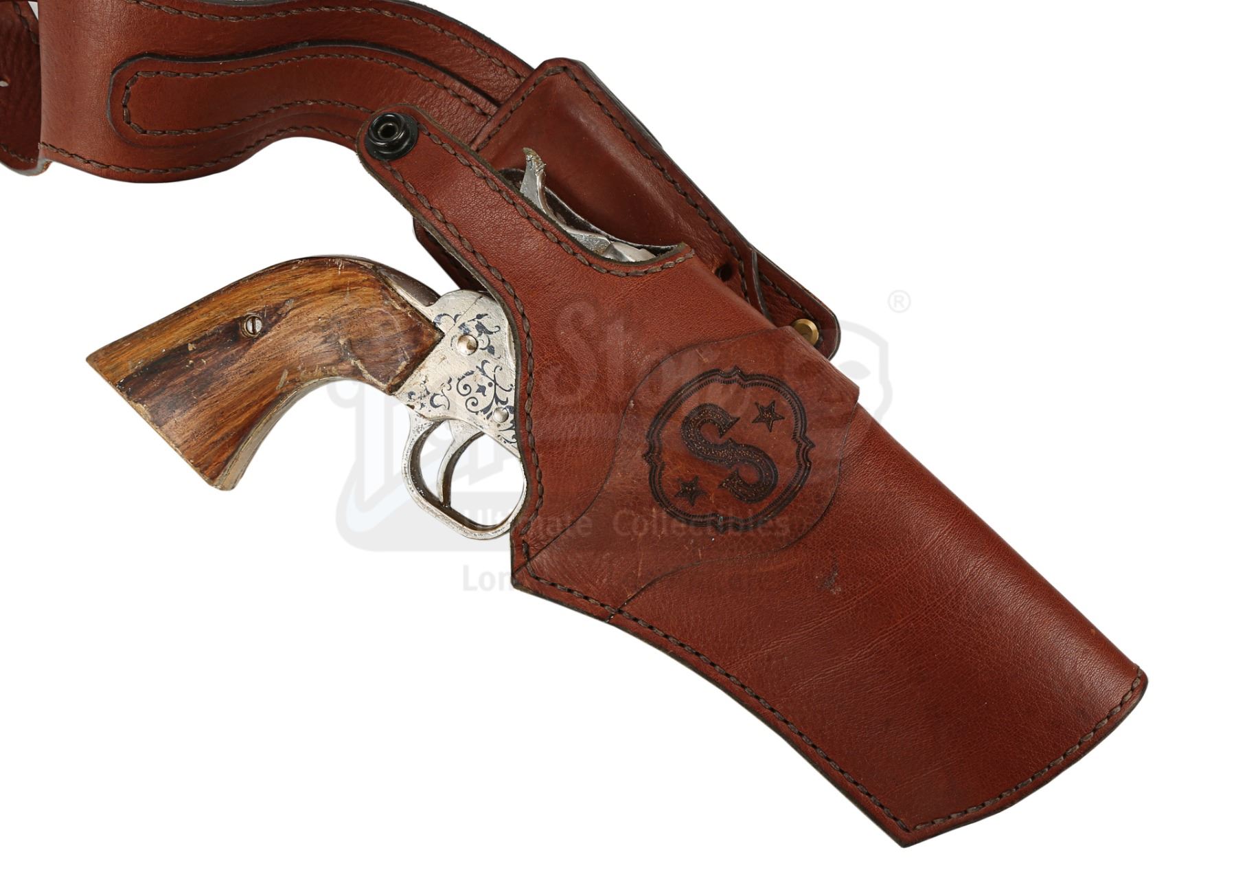 The revolvers are made of hardened rubber and feature an intricate black floral pattern along the length of each weapon. The pistols are hand-painted to resemble metal and wood, and secured in a leather shoulder holster. There is a belt loop on each holster to hold them in place, and the insignia of the Statesman organisation is engraved on the front. The guns have varying degrees of wear from production use. Both have scuffing and scratches, and their metallic base layers - faux-gold and silver respectively - are showing through the paint finish. The patterning is also heavily worn in places. Dimensions (each revolver): 25.5 cm x 4.5 cm x 14.5 cm (10" x 1 3/4" x 5 3/4")