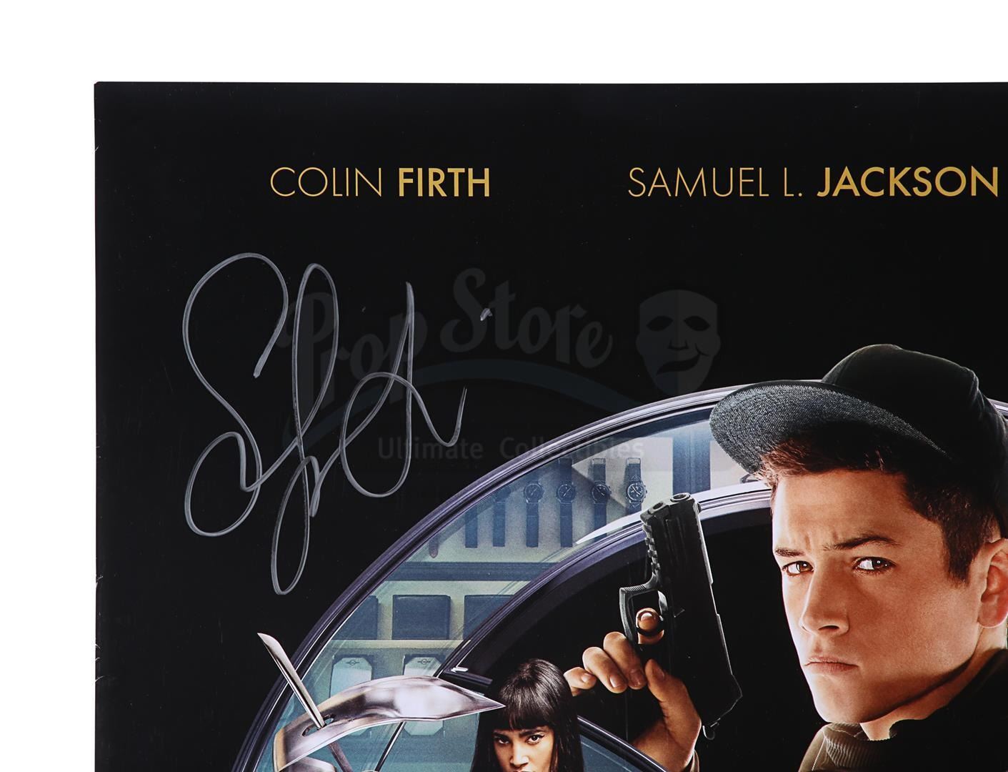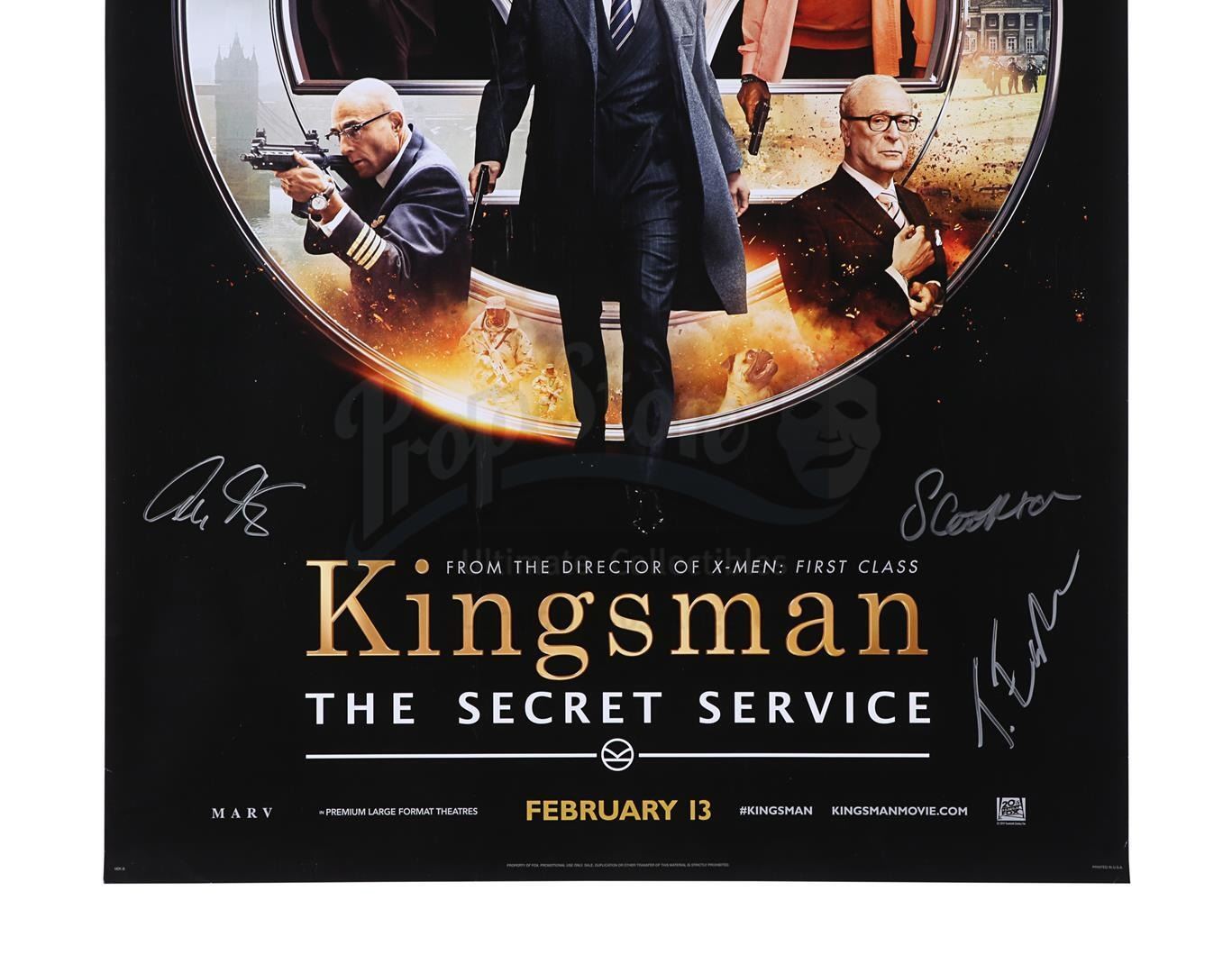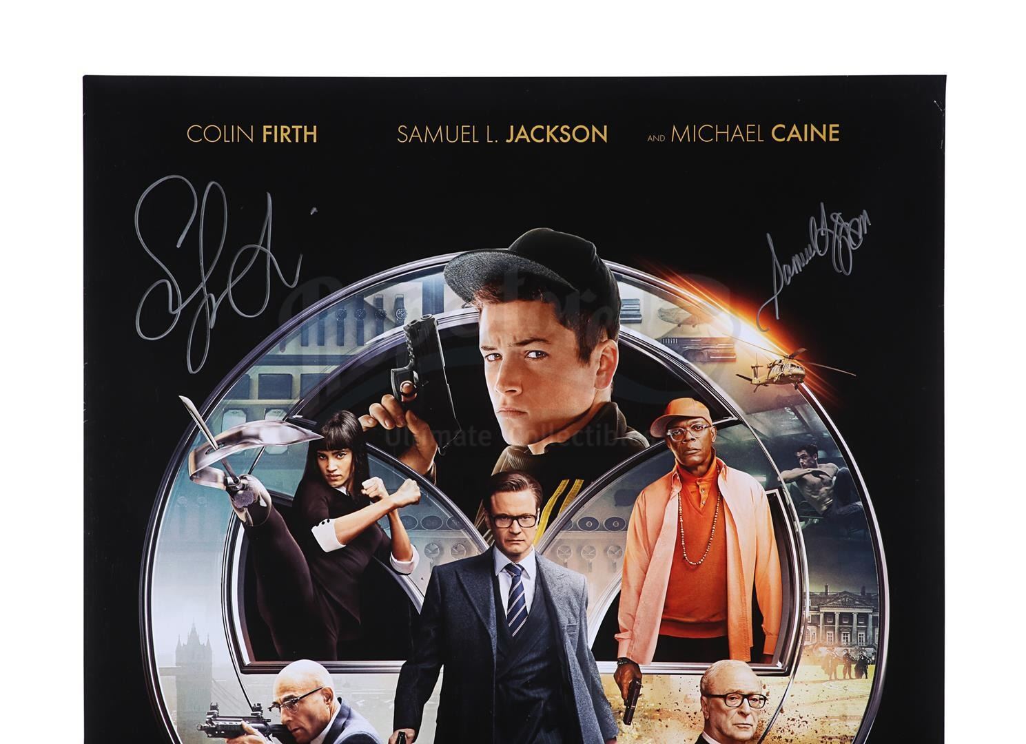 An autographed poster from the promotion of Matthew Vaughn's action comedy Kingsman: The Secret Service. Printed on glossy paper, this one-sheet poster depicts Eggsy (Taron Egerton), Valentine (Samuel L. Jackson), Gazelle (Sofia Boutella), Merlin (Mark Strong), Harry Hart (Colin Firth) and Arthur (Michael Caine) all situated on top of the Kingsman emblem. Explosions and various action-packed scenes from the film are incorporated into the emblem's design. The poster is autographed in silver-coloured ink by Firth, Egerton, Jackson, Boutella and Sophie Cookson, who plays Roxy. The poster shows minimal wear, with a few small creases caused by it being previously unrolled. Dimensions: 101.5 cm x 68.5 cm (40" x 27")