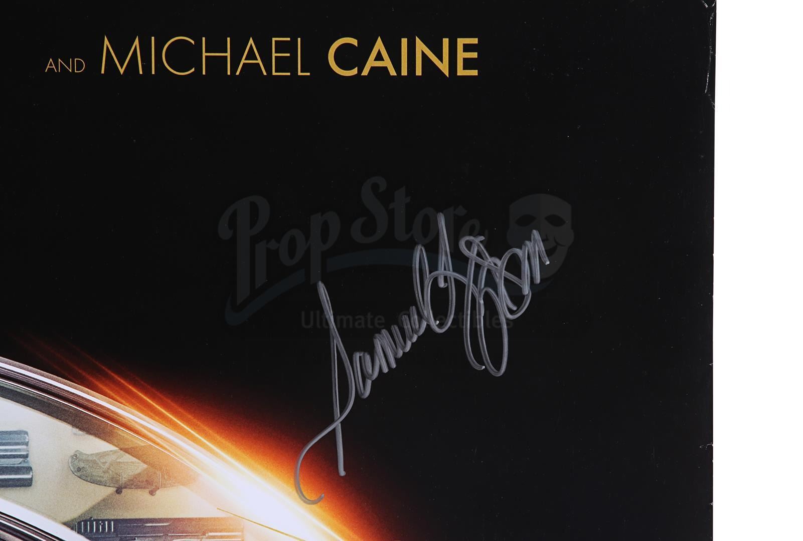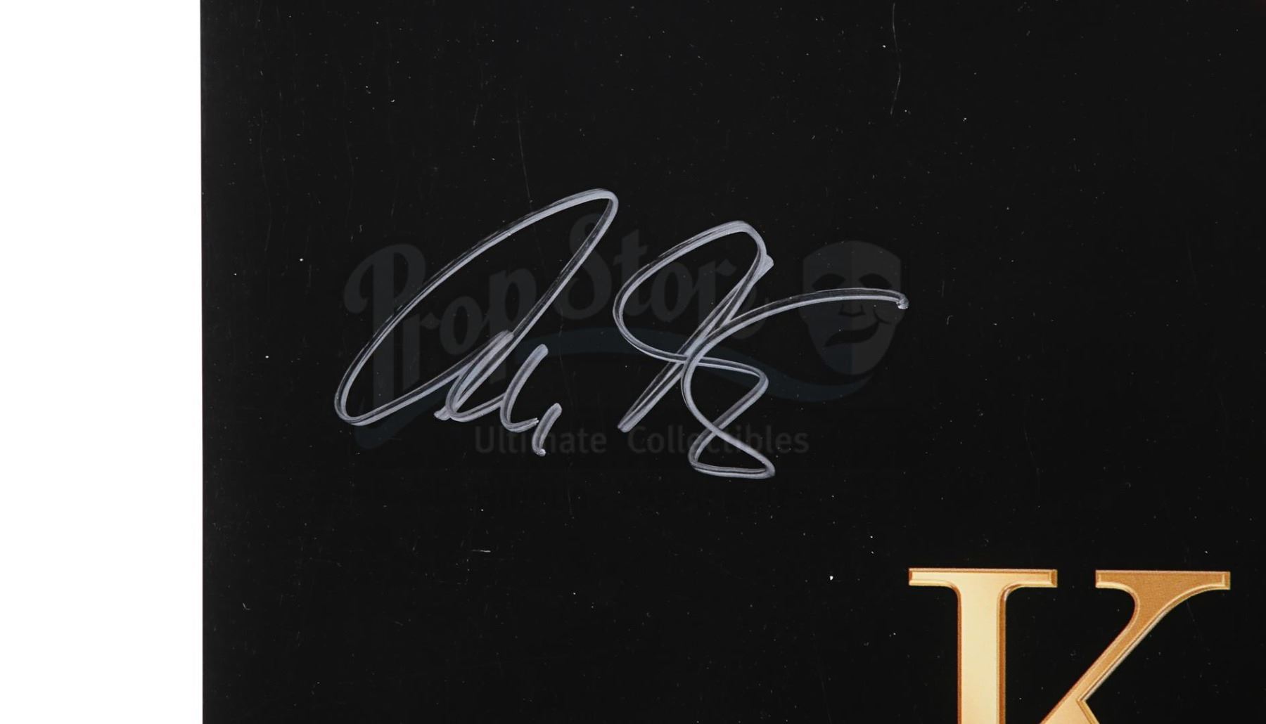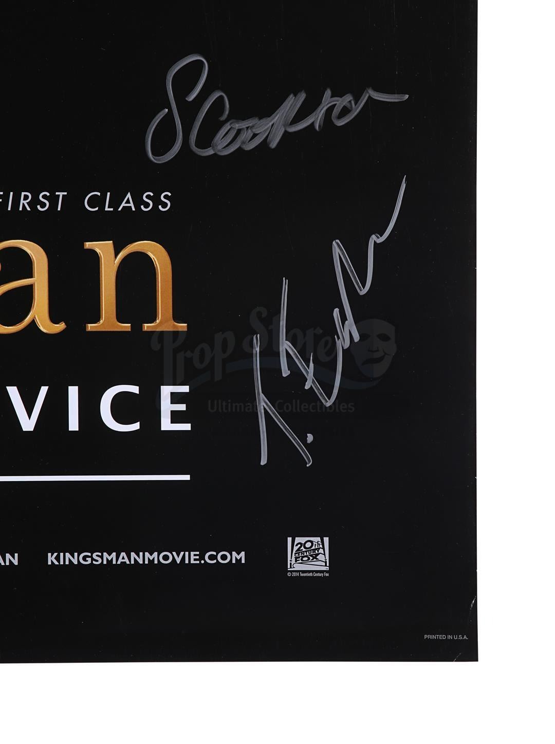 An autographed poster from the promotion of Matthew Vaughn's action comedy Kingsman: The Secret Service. Printed on glossy paper, this one-sheet poster depicts Eggsy (Taron Egerton), Valentine (Samuel L. Jackson), Gazelle (Sofia Boutella), Merlin (Mark Strong), Harry Hart (Colin Firth) and Arthur (Michael Caine) all situated on top of the Kingsman emblem. Explosions and various action-packed scenes from the film are incorporated into the emblem's design. The poster is autographed in silver-coloured ink by Firth, Egerton, Jackson, Boutella and Sophie Cookson, who plays Roxy. The poster shows minimal wear, with a few small creases caused by it being previously unrolled. Dimensions: 101.5 cm x 68.5 cm (40" x 27")