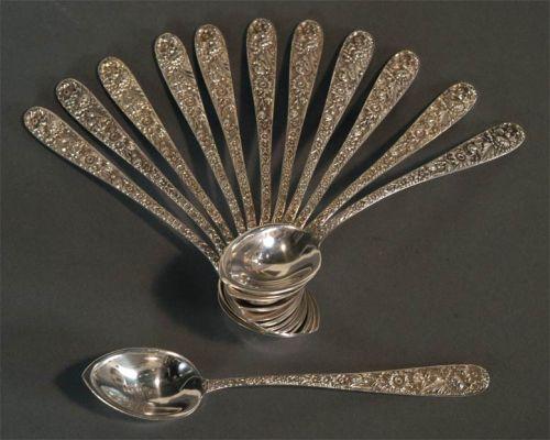 KIRK & SON REPOUSSE GRAPEFRUIT SPOONS (12), each 6" long 368 grams, condition: excellent, PACKING AND SHIPPING (excluding insurance) $20,