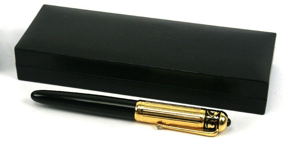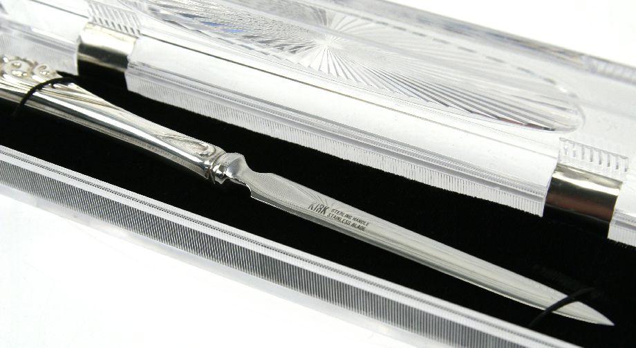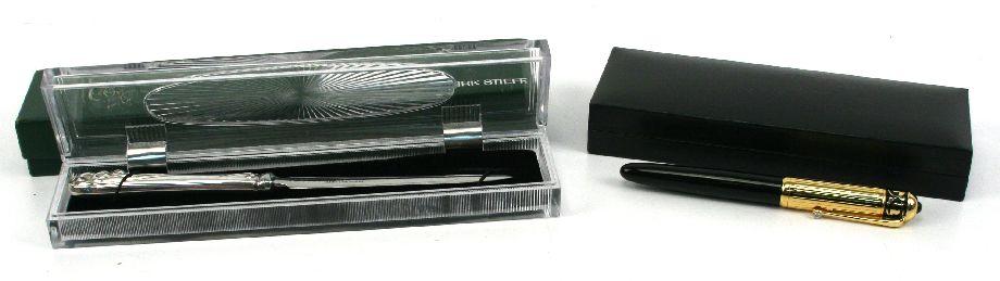 8 inch sterling handle Kirk Stieff letter opener in original box and a Bombay Co. gold gilt fountain pen in original display box.