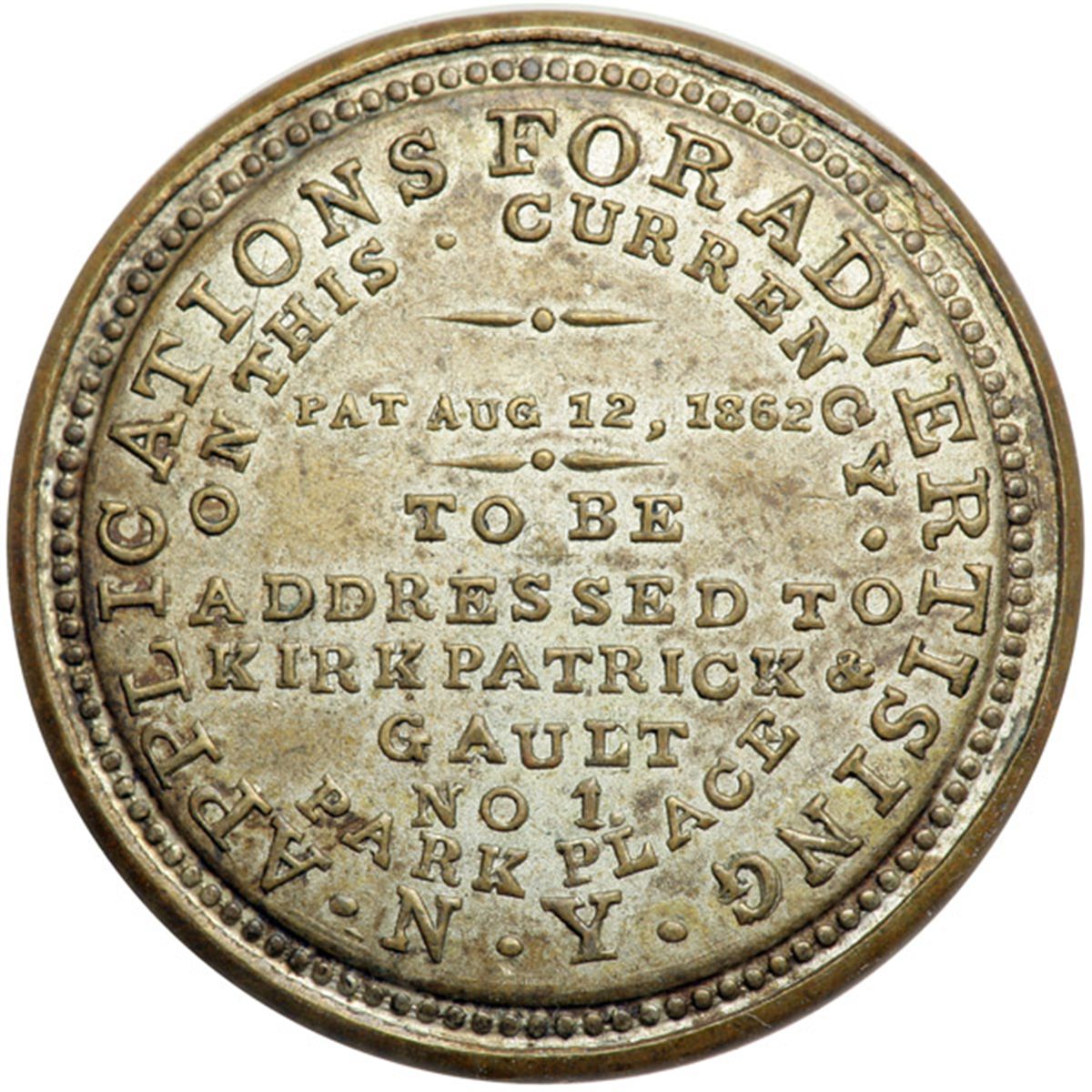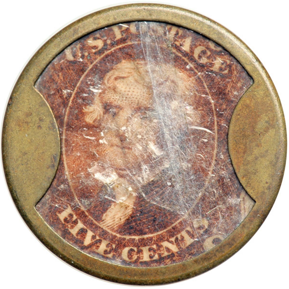 "KIRKPATRICK & GAULT" EP-83, HB-162, S-115 5¢. . Fr-EP-83. The case of this piece displays loads of original silvering, and appears unopened and problem-free. The mica is unfortunately heavily crazed but is free of any major damage. The stamp appears to be relatively bright and is well centered. Choice Extremely Fine.
