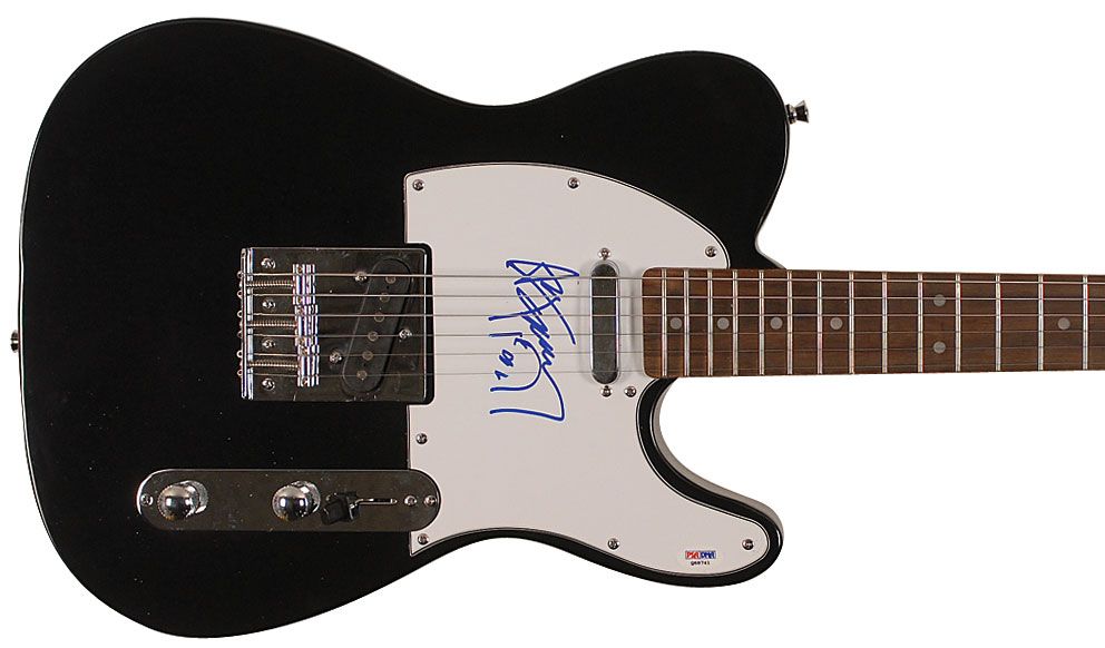 Black-bodied Stedman Pro ‘telecaster-style’ electric guitar, signed on the white pickguard in blue felt tip, with Frehley adding a quick playing card sketch. In fine condition. Accompanied by a certificate of authenticity from PSA/DNA and a photo taken at time of signing. Oversized.