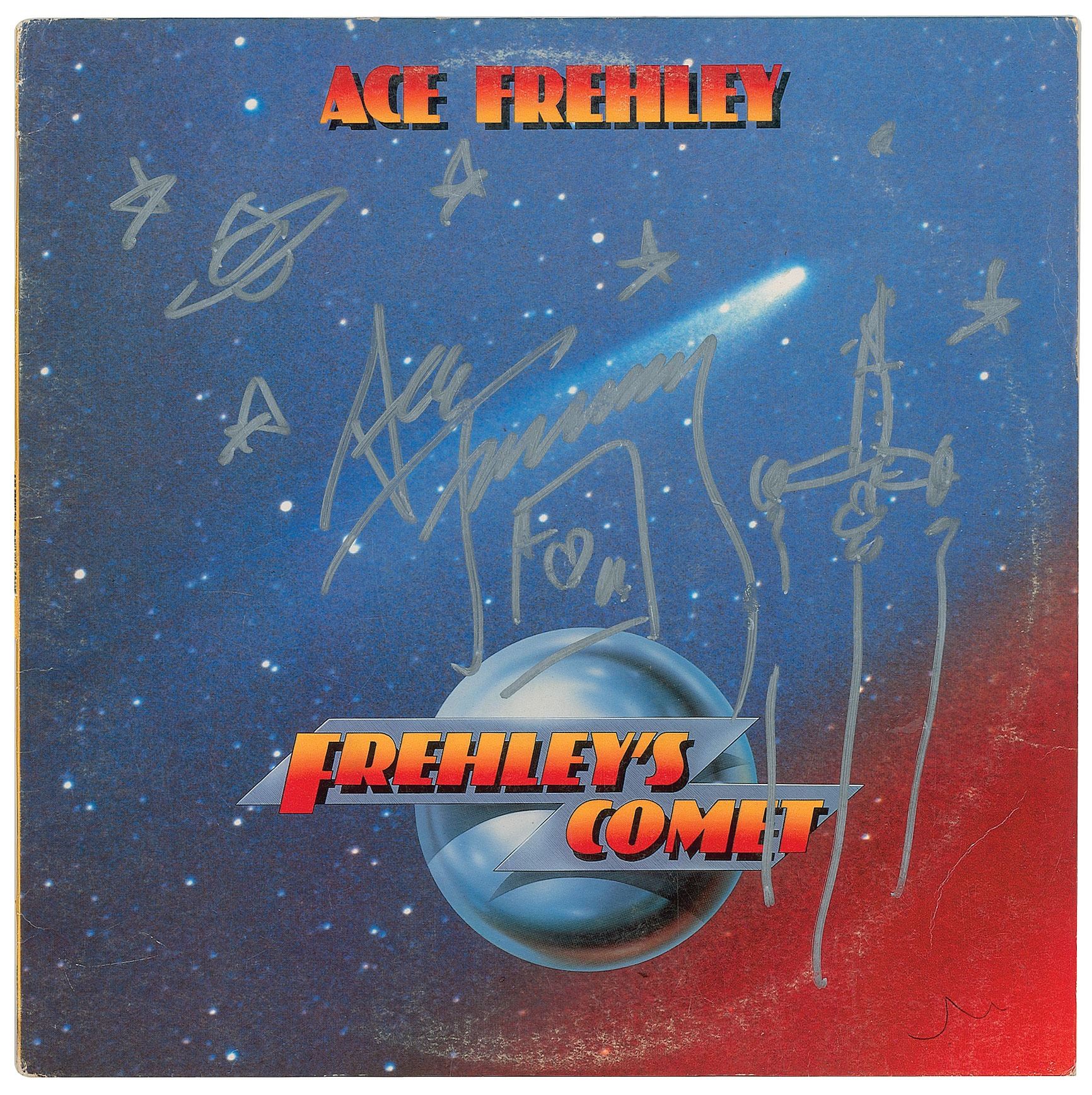 Frehley's Comet album, signed on the front cover in silver ink by Ace Frehley, who adds a playing card, a rocket ship, and a planet with surrounding stars. In fine condition, with light scuffing. The record is included.