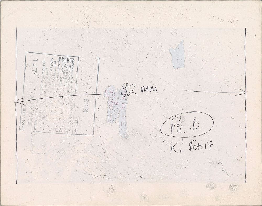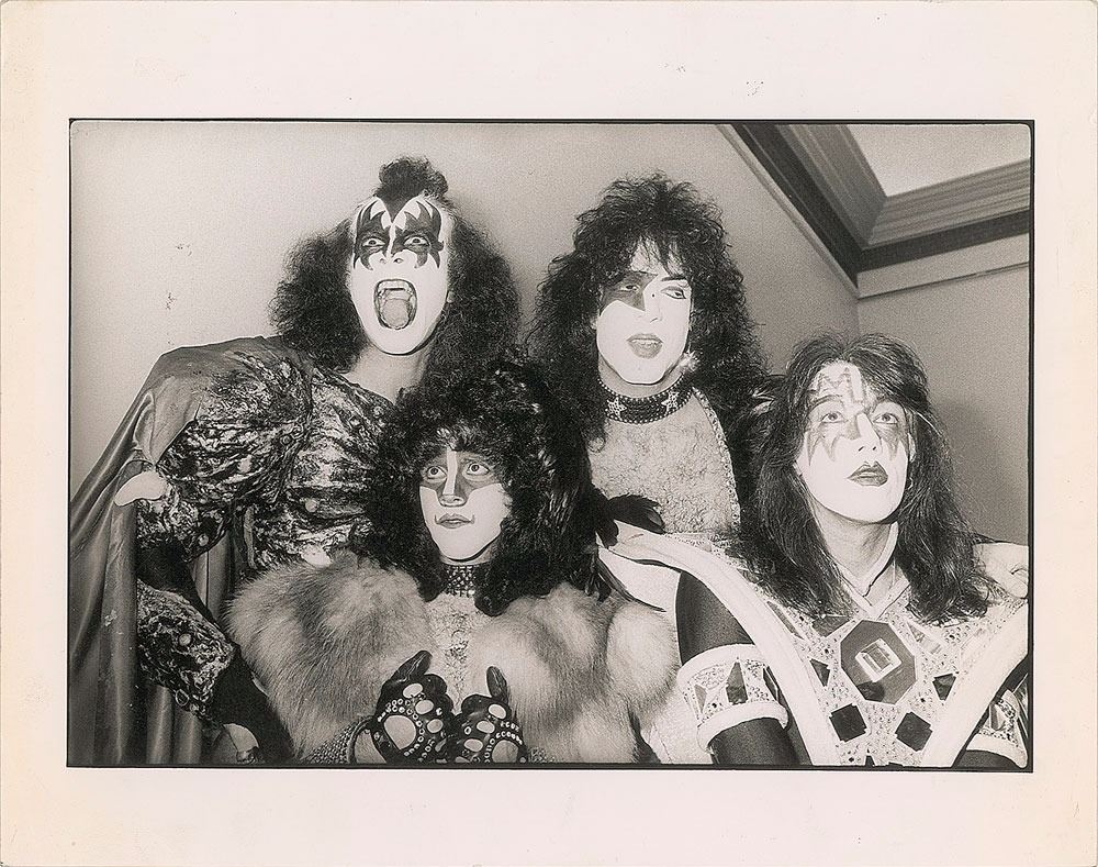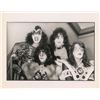 Original vintage satin-finish 12 x 9.5 photo of KISS in full costume and makeup. Reverse bears a Paul Cox photographer’s stamp. In fine condition, with scattered creasing (heaviest to lower left), mild yellowing to portions of blank background, and surface marks to left side.