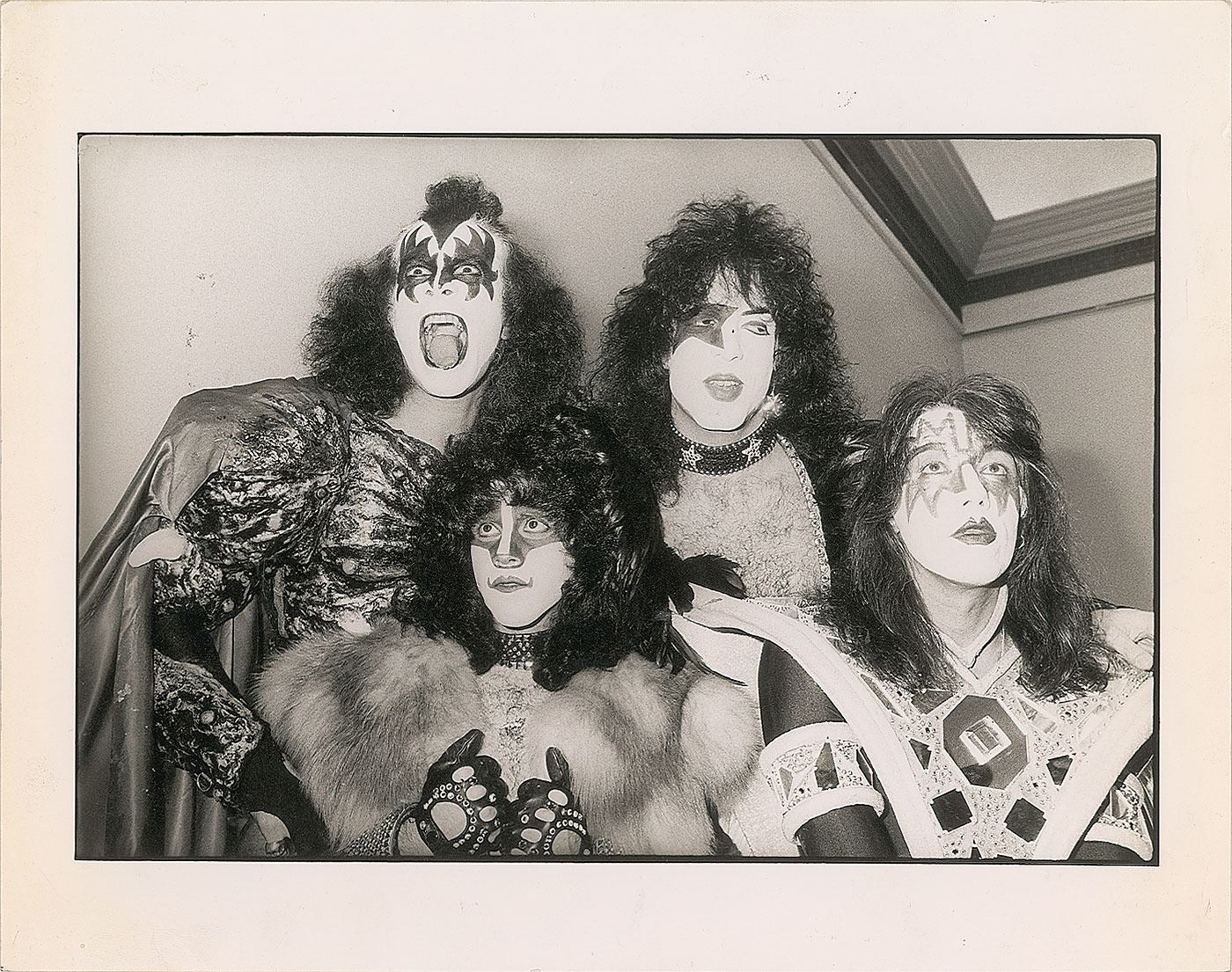 Original vintage satin-finish 12 x 9.5 photo of KISS in full costume and makeup. Reverse bears a Paul Cox photographer’s stamp. In fine condition, with scattered creasing (heaviest to lower left), mild yellowing to portions of blank background, and surface marks to left side. From the Globe Photo archives.