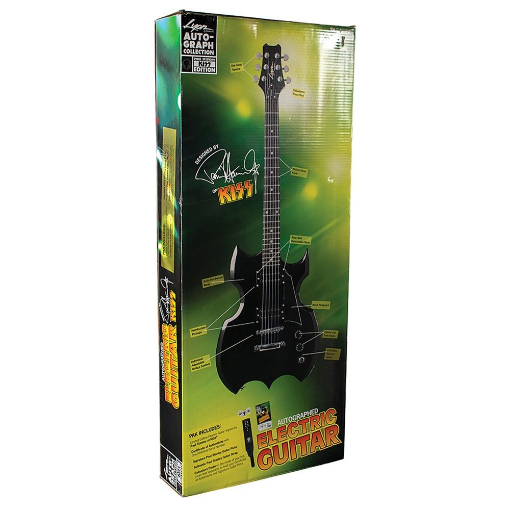 Black ‘Paul Stanley KISS Edition’ Lyon electric guitar by Washburn, signed on the black pickguard in silver ink by Stanley. The guitar is housed in its original packaging, 17.5 x 41.5 x 5.25, which has been since taped close; the edition includes a certificate of authenticity, signature guitar picks and strap, and a collector’s poster. In fine condition, with some light wear to the box.