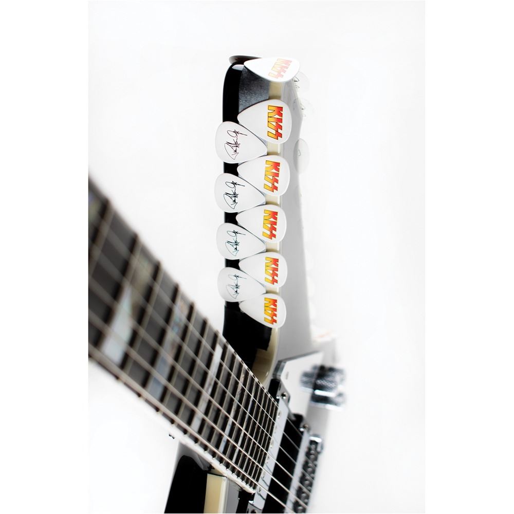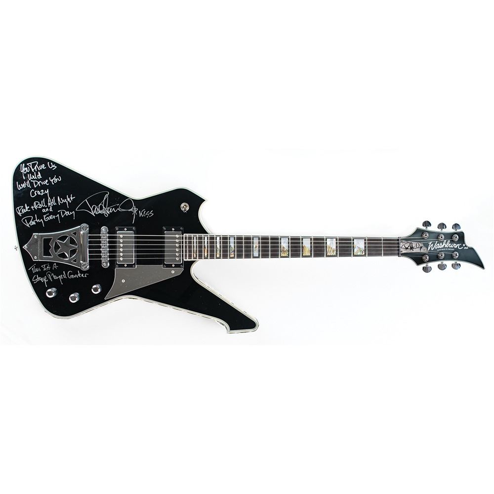 Gorgeous black-bodied Washburn PS2000 electric guitar used on stage by KISS guitarist Paul Stanley, signed on the body in silver ink, ‰ÛÏPaul Stanley, KISS, This is a stage played guitar,‰Û with Stanley adding lyrics to the song ‰Û÷Rock and Roll All Nite‰Ûª‰ÛÓ ‰ÛÏYou drive us wild, we‰Ûªll drive you crazy, rock + roll all night and party every day.‰Û The bottom curve of the guitar body is lined with 40 affixed KISS / Paul Stanley guitar picks. The guitar features white binding to neck and headstock, a mirror pickguard, chrome hardware, and a slim mahogany neck with an ebony fretboard and mother of pearl/abalone inlays. Includes a signed handwritten statement of authenticity: ‰ÛÏI used this Washburn 10 Anniversary PS 2000 guitar extensively on tour with KISS. Paul Stanley.‰Û In fine condition. Accompanied by a custom G&G hardshell carrying case. A beautiful stage-used guitar backed by provenance from one of rock's most influential players.