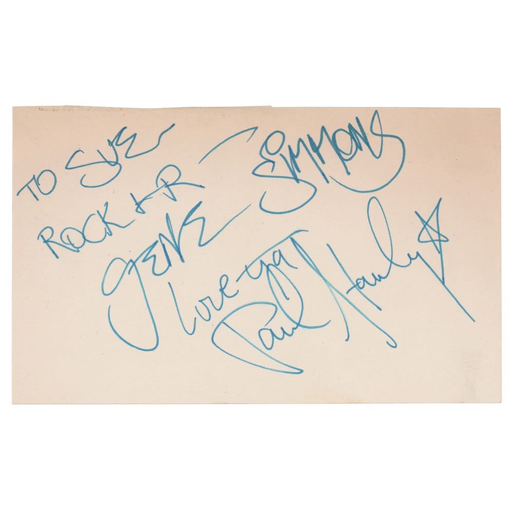 Vintage circa 1975 blue ink signatures from KISS on a pair of off-white 5 x 3 cards—“To Sue, Rock & R—Gene Simmons” and “Love ya, Paul Stanley”; and “Peter Criss” and “Ace Frehley.” The consignor notes that the autographs were obtained on May 11, 1975, at the Sheraton Hotel in Boston, when the band were in town to perform at the Orpheum Theatre. In fine condition. Accompanied by a certificate of authenticity from Tracks.