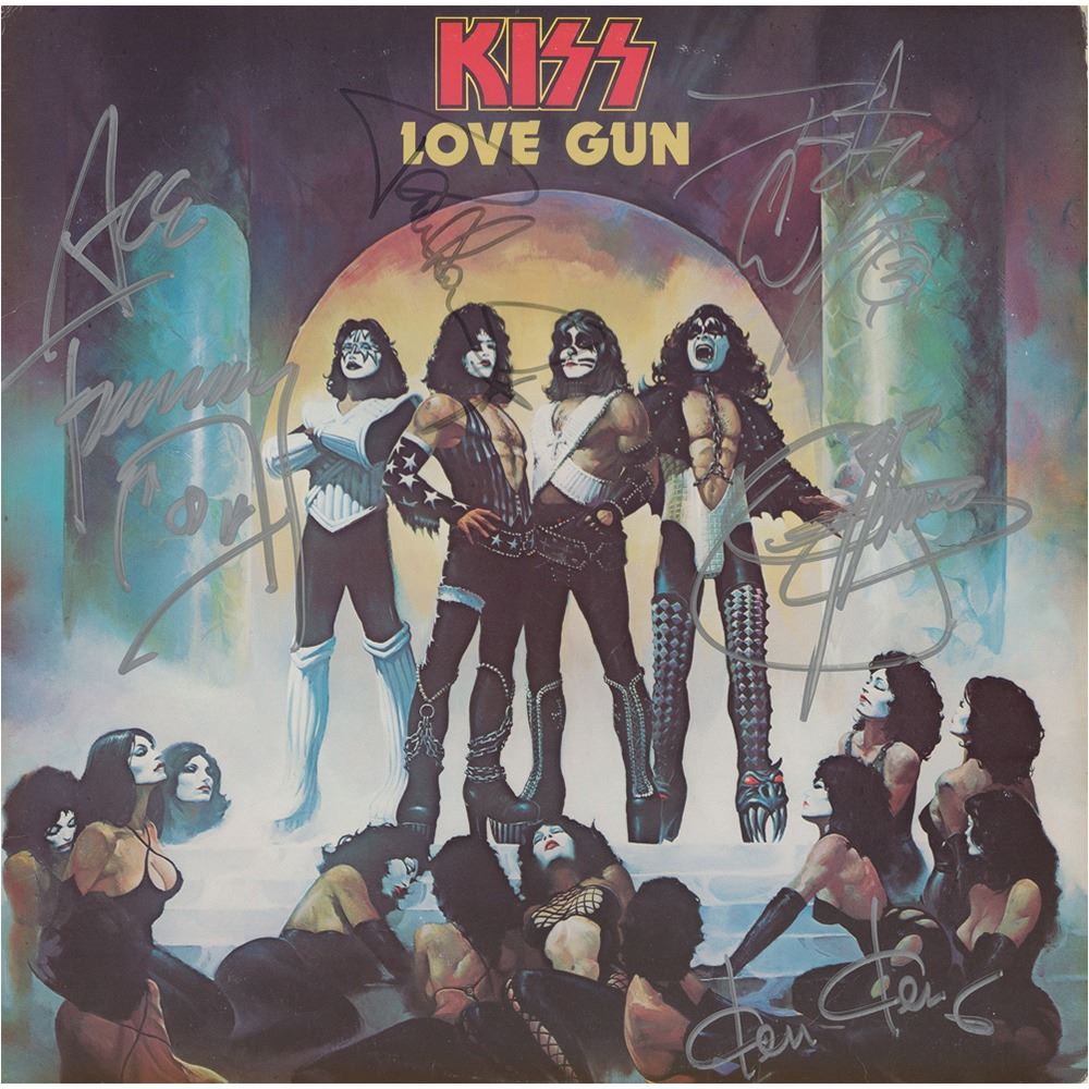 Love Gun album by KISS, signed on the front cover in silver ink by Ace Frehley, Gene Simmons, and Peter Criss, and in black felt tip by Paul Stanley; the cover is also signed by artist Ken Kelly. In fine condition. The record is not included. Accompanied by a full letter of authenticity from JSA.