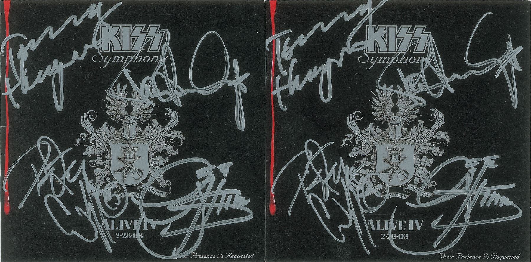 Pair of CD booklets for Kiss Symphony: Alive IV, both signed on the front cover in silver ink by Paul Stanley, Gene Simmons, Peter Criss, and Tommy Thayer. In overall fine condition. The CDs are not included.