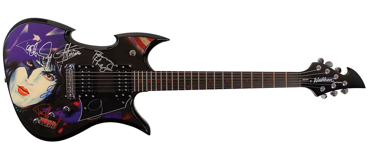 Exceptional Washburn PS400 Paul Stanley electric guitar, with an image of Stanley on the body, as well as the band’s name and Stanley’s facsimile signature, signed on the body in silver ink by Gene Simmons, Paul Stanley, and Tommy Thayer and in blue felt tip by Eric Singer. There is an extra “G” from Simmons starting his signature on the pickguard. In fine condition. All signatures were acquired on July 21, 2012, at Farm Bureau Live in Virginia Beach during their World Tour and the guitar is accompanied by a letter of provenance from the original recipient of the signatures, as well as the original colorful gig bag. A rock and roll scarcity as the band routinely refuses to sign any musical instruments. Oversized.