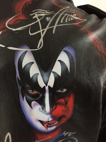 One of a kind hand-painted and autographed leather jacket of the four original band members of KISS (Gene Simmons, Paul Stanley, Peter Chriss and Ace Frehley). Features hand painted pictures of each member of KISS on the back. Each photo is signed by the band members. Jacket is zip-up, a belted at the waist with two small pockets just above belt, and one zip pocket on left side of chest.