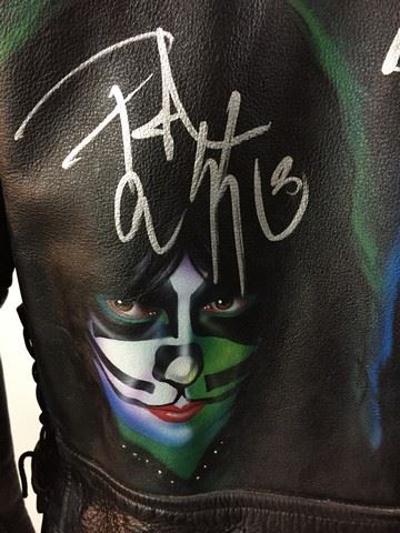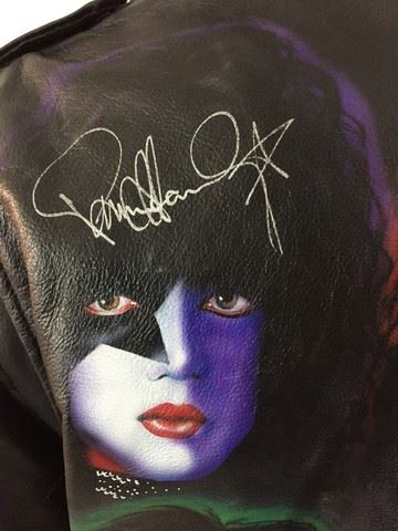 One of a kind hand-painted and autographed leather jacket of the four original band members of KISS (Gene Simmons, Paul Stanley, Peter Chriss and Ace Frehley). Features hand painted pictures of each member of KISS on the back. Each photo is signed by the band members. Jacket is zip-up, a belted at the waist with two small pockets just above belt, and one zip pocket on left side of chest.