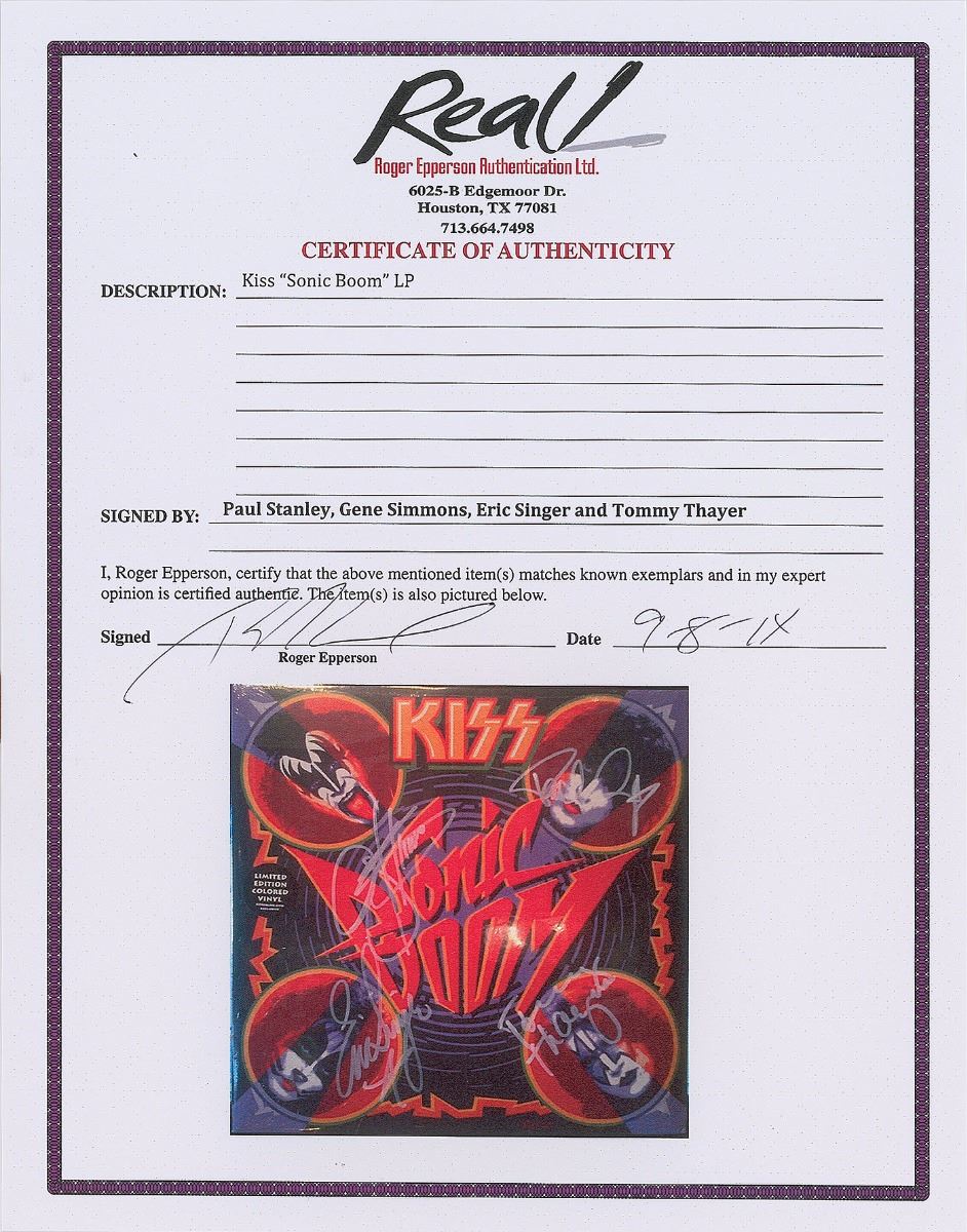Sonic Boom album signed on the front cover in white ink by Gene Simmons, Paul Stanley, Eric Singer, and Tommy Thayer. In fine condition. The record is included. Accompanied by a full letter of authenticity from REAL.