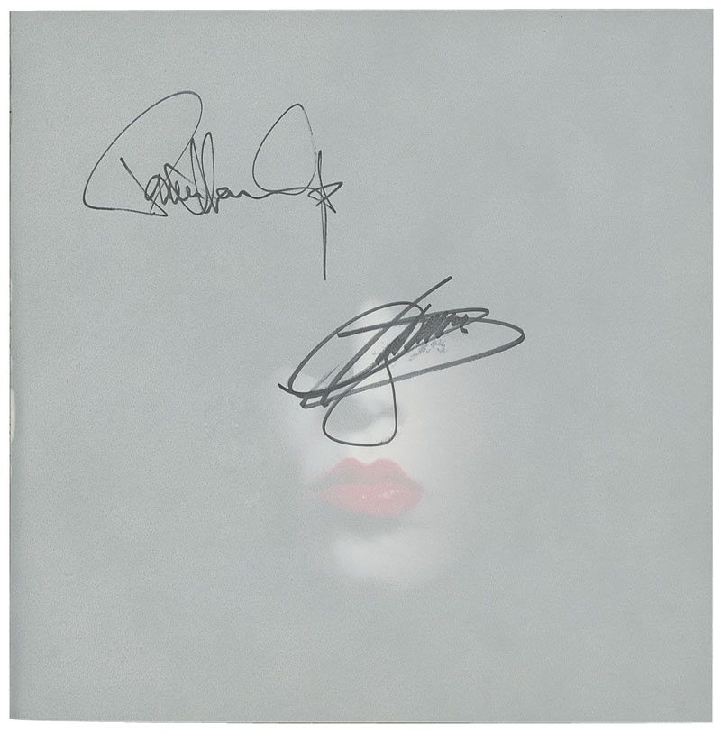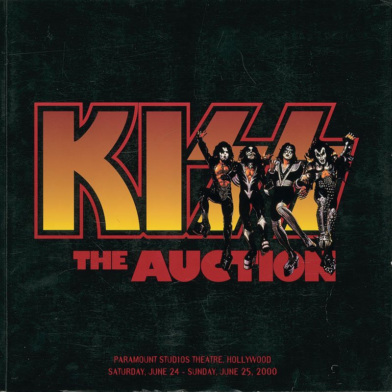 KISS: The Auction catalog, from the 2000 auction held at Paramount Studios Theatre in Hollywood, 12.5 x 12.5, 186 pages. Signed in black felt tip on a special signature page by Paul Stanley and Gene Simmons. Scattered cover wear as well as expected handling wear, otherwise fine condition.