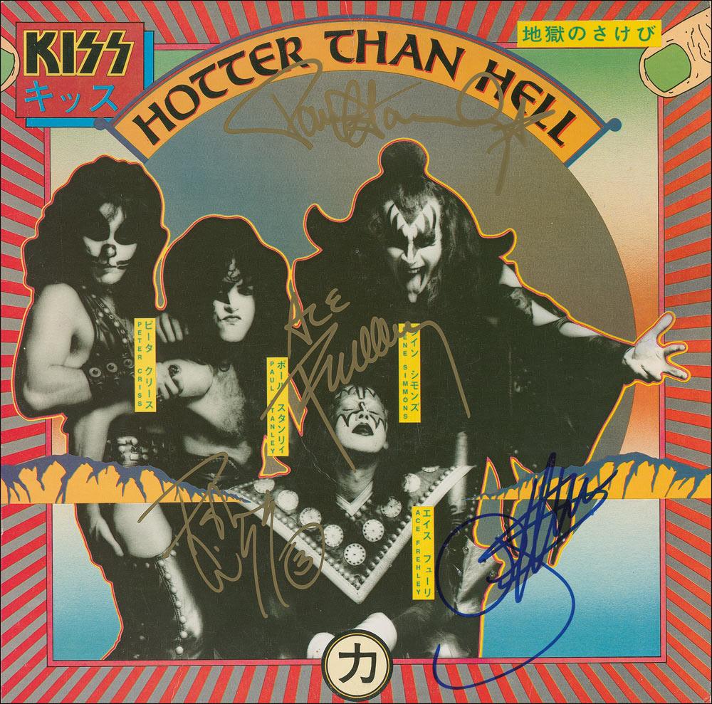 Hotter Than Hell album signed on the front cover in gold ink by Paul Stanley, Peter Criss, and Ace Frehley, and in blue felt tip by Gene Simmons. In fine condition. The record is included.