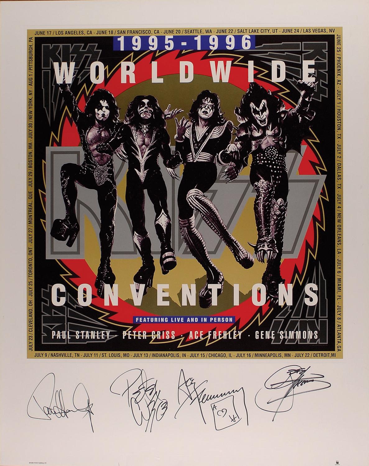 Fabulous color 26 x 33 print for the 1995 -1996 KISS Worldwide Convention, signed in the large lower border in black felt tip by Paul Stanley, Gene Simmons, Peter Criss, and Ace Frehley, adding a sketch of a playing card. Rolled and in fine condition with a few creases.